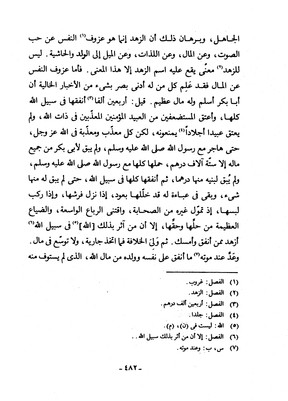 الْجَاهِلُ، وَبُرْهَانُ ذَلِكَ أَنَّ الزُّهْدَ إِنَّمَا هُوَ عُزُوفُ (¬1) النَّفْسِ عَنْ حُبِّ الصَّوْتِ، وَعَنِ الْمَالِ، وَعَنِ اللَّذَّاتِ، وَعَنِ الْمَيْلِ إِلَى الْوَلَدِ وَالْحَاشِيَةِ، لَيْسَ لِلزُّهْدِ (¬2) مَعْنًى يَقَعُ عَلَيْهِ اسْمُ الزُّهْدِ إِلَّا هَذَا الْمَعْنَى، فَأَمَّا عُزُوفُ النَّفْسِ عَنِ الْمَالِ فَقَدْ عَلِمَ كُلُّ مَنْ لَهُ أَدْنَى بَصَرٍ بِشَيْءٍ مِنَ الْأَخْبَارِ الْخَالِيَةِ أَنَّ أَبَا بَكْرٍ أَسْلَمَ وَلَهُ مَالٌ عَظِيمٌ، قِيلَ: أَرْبَعِينَ أَلْفًا (¬3) أَنْفَقَهَا فِي سَبِيلِ اللَّهِ كُلَّهَا، وَأَعْتَقَ الْمُسْتَضْعَفِينَ مِنَ الْعَبِيدِ الْمُؤْمِنِينَ الْمُعَذَّبِينَ فِي ذَاتِ اللَّهِ، وَلَمْ يُعْتِقْ عَبِيدًا أَجْلَادًا (¬4) يَمْنَعُونَهُ، لَكِنْ كُلَّ مُعَذَّبٍ وَمُعَذَّبَةٍ فِي اللَّهِ عَزَّ وَجَلَّ، حَتَّى هَاجَرَ مَعَ رَسُولِ اللَّهِ صَلَّى اللَّهُ عَلَيْهِ وَسَلَّمَ، وَلَمْ يَبْقَ لِأَبِي بَكْرٍ مِنْ جَمِيعِ مَالِهِ إِلَّا سِتَّةُ آلَافِ دِرْهَمٍ حَمَلَهَا كُلَّهَا مَعَ رَسُولِ اللَّهِ صَلَّى اللَّهُ عَلَيْهِ وَسَلَّمَ، وَلَمْ يُبْقِ لِبَنِيهِ مِنْهَا دِرْهَمًا، ثُمَّ أَنْفَقَهَا كُلَّهَا فِي سَبِيلِ اللَّهِ، حَتَّى لَمْ يَبْقَ لَهُ مِنْهَا شَيْءٌ، وَبَقِيَ فِي عَبَاءَةٍ لَهُ قَدْ خَلَّلَهَا بِعُودٍ، إِذَا نَزَلَ فَرَشَهَا، وَإِذَا رَكِبَ لَبِسَهَا، إِذْ تَمَوَّلَ غَيْرُهُ مِنَ الصَّحَابَةِ، وَاقْتَنَى الرِّبَاعَ الْوَاسِعَةَ، وَالضِّيَاعَ الْعَظِيمَةَ مِنْ حِلِّهَا وَحَقِّهَا، إِلَّا أَنَّ مَنْ آثَرَ بِذَلِكَ (اللَّهَ) (¬5) فِي سَبِيلِ اللَّهِ (¬6) أَزْهَدُ مِمَّنْ أَنْفَقَ وَأَمْسَكَ، ثُمَّ وَلِيَ الْخِلَافَةَ فَمَا اتَّخَذَ جَارِيَةً، وَلَا تَوَسَّعَ فِي مَالٍ.