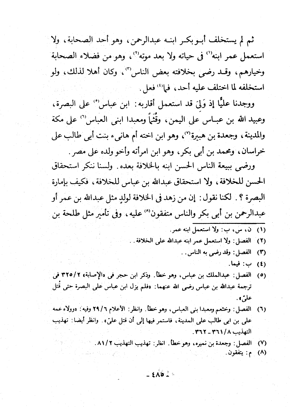 وَرَضِيَ بِبَيْعَةِ النَّاسِ الْحَسَنَ ابْنَهُ بِالْخِلَافَةِ بَعْدَهُ، وَلَسْنَا نُنْكِرُ اسْتِحْقَاقَ الْحَسَنِ لِلْخِلَافَةِ، وَلَا اسْتِحْقَاقَ عَبْدِ اللَّهِ بْنِ عَبَّاسٍ لِلْخِلَافَةِ، فَكَيْفَ بِإِمَارَةِ الْبَصْرَةِ، لَكِنَّا نَقُولُ: إِنَّ مَنْ زَهِدَ فِي الْخِلَافَةِ لِوَلَدٍ مِثْلِ عَبْدِ اللَّهِ بْنِ عُمَرَ أَوْ عَبْدِ الرَّحْمَنِ بْنِ أَبِي بَكْرٍ وَالنَّاسُ مُتَّفِقُونَ (¬8) عَلَيْهِ، وَفِي تَأْمِيرِ مِثْلِ طَلْحَةَ بْنِ