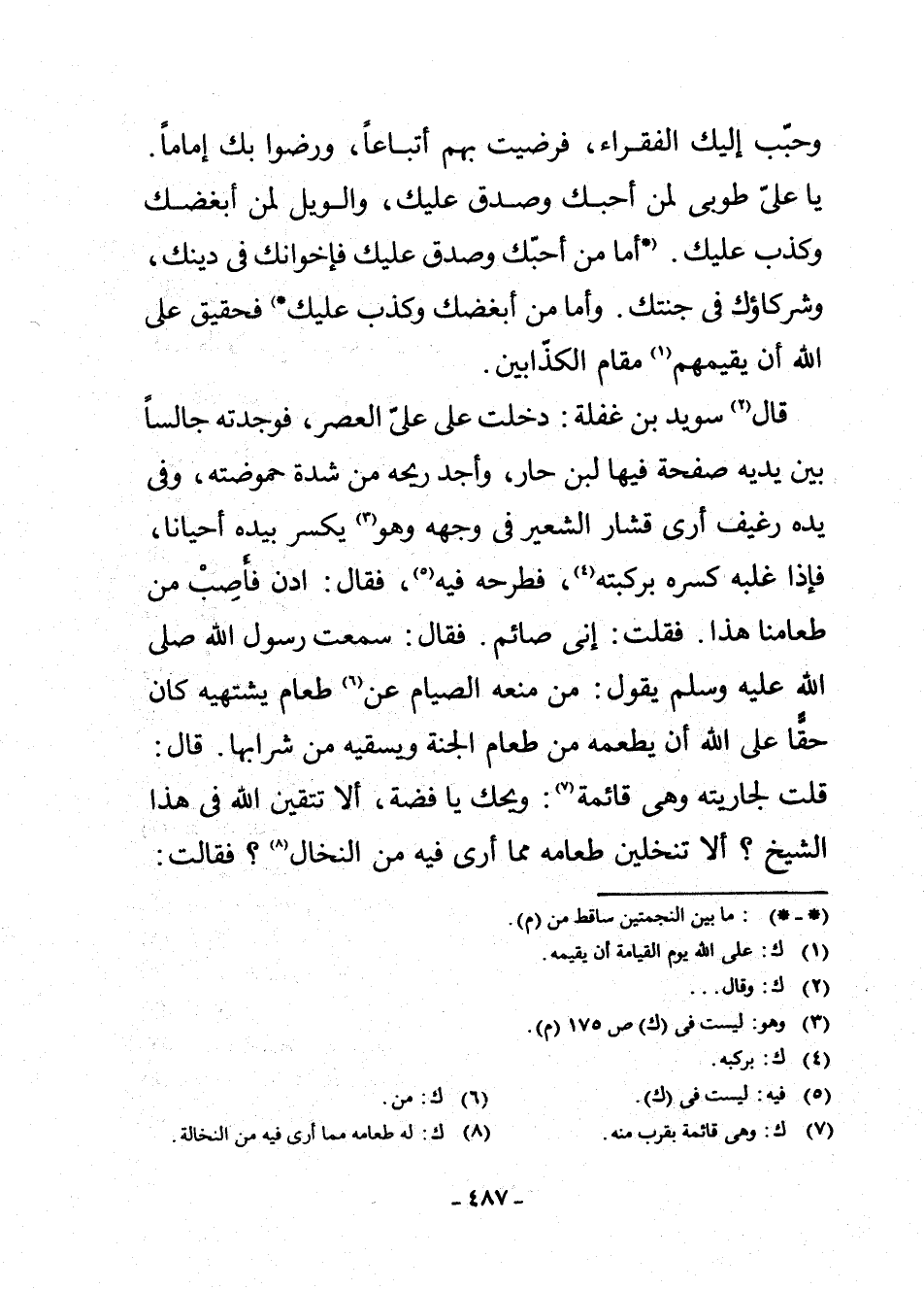 قَالَ (¬3) سُوَيْدُ بْنُ غَفْلَةَ: دَخَلْتُ عَلَى عَلِيٍّ الْعَصْرَ، فَوَجَدْتُهُ جَالِسًا بَيْنَ يَدَيْهِ صَفْحَةٌ فِيهَا لَبَنٌ حَارٌّ، وَأَجِدُ رِيحَهُ مِنْ شِدَّةِ حُمُوضَتِهِ، وَفِي يَدِهِ رَغِيفٌ أَرَى قُشَارَ الشَّعِيرِ فِي وَجْهِهِ، وَهُوَ (¬4) يَكْسِرُ بِيَدِهِ أَحْيَانًا، فَإِذَا غَلَبَهُ كَسَرَهُ بِرُكْبَتِهِ (¬5) ، فَطَرَحَهُ فِيهِ (¬6) ، فَقَالَ: ادْنُ فَأَصِبْ مِنْ طَعَامِنَا هَذَا، فَقُلْتُ: إِنِّي صَائِمٌ، فَقَالَ: سَمِعْتُ رَسُولَ اللَّهِ صَلَّى اللَّهُ عَلَيْهِ وَسَلَّمَ يَقُولُ: «مَنْ مَنَعَهُ الصِّيَامُ عَنْ (¬7) طَعَامٍ يَشْتَهِيهِ كَانَ حَقًّا عَلَى اللَّهِ أَنْ يُطْعِمَهُ مِنْ طَعَامِ الْجَنَّةِ، وَيَسْقِيَهُ مِنْ شَرَابِهَا» . قَالَ: قُلْتُ لِجَارِيَتِهِ وَهِيَ قَائِمَةٌ (¬8) : وَيْحَكِ يَا فِضَّةُ! أَلَا تَتَّقِينَ اللَّهَ فِي هَذَا الشَّيْخِ؟ أَلَا تَنْخُلِينَ طَعَامَهُ مِمَّا أَرَى فِيهِ مِنَ النُّخَالِ (¬9) ؟ فَقَالَتْ:
