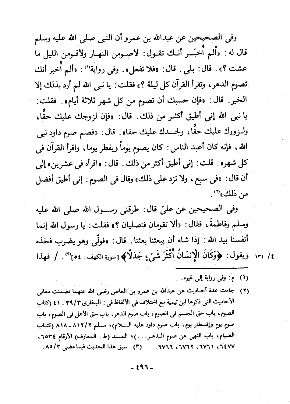 وَفِي الصَّحِيحَيْنِ عَنْ عَبْدِ اللَّهِ بْنِ عَمْرٍو، «أَنَّ النَّبِيَّ صَلَّى اللَّهُ عَلَيْهِ وَسَلَّمَ قَالَ لَهُ: " أَلَمْ أُخْبَرْ أَنَّكَ تَقُولُ: لَأَصُومَنَّ النَّهَارَ وَلَأَقُومَنَّ اللَّيْلَ مَا عِشْتُ؟ " قَالَ: بَلَى. قَالَ: " فَلَا تَفْعَلْ» . وَفِي رِوَايَةٍ (¬1) : " «أَلَمْ أُخْبَرْ أَنَّكَ تَصُومُ الدَّهْرَ، وَتَقْرَأُ الْقُرْآنَ كُلَّ لَيْلَةٍ؟ " فَقُلْتُ: يَا نَبِيَّ اللَّهِ، لَمْ أُرِدْ بِذَلِكَ إِلَّا الْخَيْرَ. قَالَ: " فَإِنَّ حَسْبَكَ أَنْ تَصُومَ مِنْ كُلِّ شَهْرٍ ثَلَاثَةَ أَيَّامٍ "، فَقُلْتُ: يَا نَبِيَّ اللَّهِ، إِنِّي أُطِيقُ أَكْثَرَ مِنْ ذَلِكَ، قَالَ: " فَإِنَّ لِزَوْجِكَ عَلَيْكَ حَقًّا، وَلِزَوْرِكَ عَلَيْكَ حَقًّا، وَلِجَسَدِكَ عَلَيْكَ حَقًّا ".