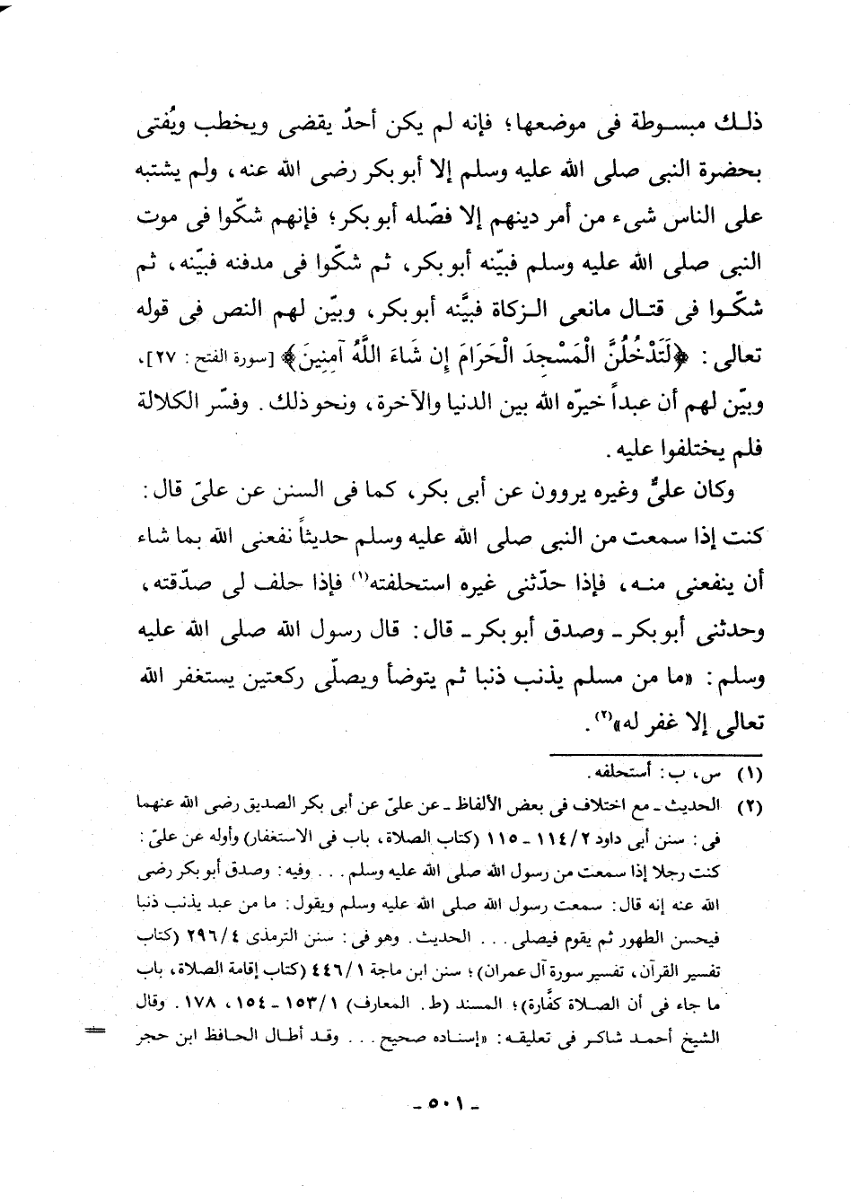 (¬2) الْحَدِيثُ مَعَ اخْتِلَافٍ فِي بَعْضِ الْأَلْفَاظِ عَنْ عَلِيٍّ عَنْ أَبِي بَكْرٍ الصِّدِّيقِ رَضِيَ اللَّهُ عَنْهُمَا فِي: سُنَنِ أَبِي دَاوُدَ 2/114 115 (كِتَابُ الصَّلَاةِ، بَابٌ فِي الِاسْتِغْفَارِ) وَأَوَّلُهُ عَنْ عَلِيٍّ: كُنْتُ رَجُلًا إِذَا سَمِعْتُ مِنْ رَسُولِ اللَّهِ صَلَّى اللَّهُ عَلَيْهِ وَسَلَّمَ. . . وَفِيهِ: وَصَدَقَ أَبُو بَكْرٍ رَضِيَ اللَّهُ عَنْهُ أَنَّهُ قَالَ: سَمِعْتُ رَسُولَ اللَّهِ صَلَّى اللَّهُ عَلَيْهِ وَسَلَّمَ وَيَقُولُ: مَا مِنْ عَبْدٍ يُذْنِبُ ذَنْبًا فَيُحْسِنُ الطَّهُورَ ثُمَّ يَقُومُ فَيُصَلِّي. . . . الْحَدِيثَ. وَهُوَ فِي سُنَنِ التِّرْمِذِيِّ 4/296 (كِتَابُ تَفْسِيرِ الْقُرْآنِ، تَفْسِيرُ سُورَةِ آلِ عِمْرَانَ) ; سُنَنِ ابْنِ مَاجَهْ 1/446 (كِتَابُ إِقَامَةِ الصَّلَاةِ، بَابُ مَا جَاءَ فِي أَنَّ الصَّلَاةَ كَفَّارَةٌ) ; الْمُسْنَدِ (ط. الْمَعَارِفِ) 1/153 154، 178، وَقَالَ الشَّيْخُ أَحْمَد شَاكِر فِي تَعْلِيقِهِ: " إِسْنَادُهُ صَحِيحٌ. . . وَقَالَ: أَطَالَ الْحَافِظُ ابْنُ حَجَرٍ الْعَسْقَلَانِيُّ فِي التَّهْذِيبِ الْكَلَامَ عَلَى هَذَا الْحَدِيثِ 1: 267 268. . . وَقَالَ: " هَذَا الْحَدِيثُ جَيِّدُ الْإِسْنَادِ " وَأَشَارَ إِلَيْهِ الْبُخَارِيُّ فِي التَّارِيخِ الْكَبِيرِ 2/1 \ 55 "