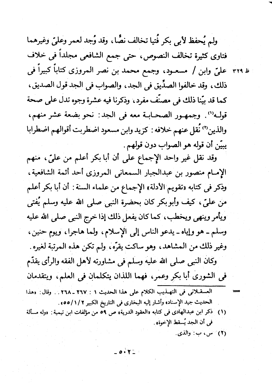 وَلَمْ يُحْفَظْ لِأَبِي بَكْرٍ فُتْيَا تُخَالِفُ نَصًّا، وَقَدْ وُجِدَ لِعُمَرَ وَعَلِيٍّ وَغَيْرِهِمَا فَتَاوَى كَثِيرَةٌ تُخَالِفُ النُّصُوصَ، حَتَّى جَمَعَ الشَّافِعِيُّ مُجَلَّدًا فِي خِلَافِ عَلِيٍّ وَابْنِ مَسْعُودٍ، وَجَمَعَ مُحَمَّدُ بْنُ نَصْرٍ الْمَرْوَزِيُّ كِتَابًا كَبِيرًا فِي ذَلِكَ، وَقَدْ خَالَفُوا الصِّدِّيقَ فِي الْجَدِّ، وَالصَّوَابُ فِي الْجَدِّ قَوْلُ الصِّدِّيقِ، كَمَا قَدْ بَيَّنَّا ذَلِكَ فِي مُصَنَّفٍ مُفْرَدٍ، وَذَكَرْنَا فِيهِ عَشَرَةَ وُجُوهٍ تَدُلُّ عَلَى صِحَّةِ قَوْلِهِ (¬1) ، وَجُمْهُورُ الصَّحَابَةِ مَعَهُ فِي الْجَدِّ: نَحْوُ بِضْعَةَ عَشَرَ مِنْهُمْ، وَالَّذِينَ (¬2) نُقِلَ عَنْهُمْ خِلَافُهُ: كَزَيْدٍ وَابْنِ مَسْعُودٍ اضْطَرَبَتْ أَقْوَالُهُمُ اضْطِرَابًا يُبَيِّنُ أَنَّ قَوْلَهُ هُوَ الصَّوَابُ دُونَ قَوْلِهِمْ.