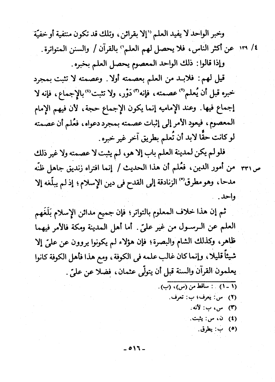 ثُمَّ إِنَّ هَذَا خِلَافُ الْمَعْلُومِ بِالتَّوَاتُرِ ; فَإِنَّ جَمِيعَ مَدَائِنِ الْإِسْلَامِ بَلَغَهُمُ الْعِلْمُ عَنِ الرَّسُولِ مِنْ غَيْرِ عَلِيٍّ، أَمَّا أَهْلُ الْمَدِينَةِ وَمَكَّةَ فَالْأَمْرُ فِيهِمَا ظَاهِرٌ، وَكَذَلِكَ الشَّامُ وَالْبَصْرَةُ، فَإِنَّ هَؤُلَاءِ لَمْ يَكُونُوا يَرْوُونَ عَنْ عَلِيٍّ إِلَّا شَيْئًا قَلِيلًا، وَإِنَّمَا كَانَ غَالِبُ عِلْمِهِ فِي الْكُوفَةِ، وَمَعَ هَذَا فَأَهْلُ الْكُوفَةِ كَانُوا يَعْلَمُونَ الْقُرْآنَ وَالسُّنَّةَ قَبْلَ أَنْ يَتَوَلَّى عُثْمَانُ فَضْلًا عَنْ عَلِيٍّ.