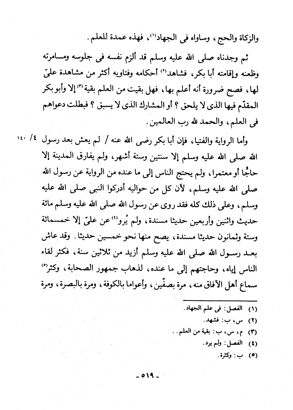 وَأَمَّا الرِّوَايَةُ وَالْفُتْيَا، فَإِنَّ أَبَا بَكْرٍ رَضِيَ اللَّهُ عَنْهُ لَمْ يَعِشْ بَعْدَ رَسُولِ اللَّهِ صَلَّى اللَّهُ عَلَيْهِ وَسَلَّمَ إِلَّا سَنَتَيْنِ وَسِتَّةَ أَشْهُرٍ، وَلَمْ يُفَارِقِ الْمَدِينَةَ إِلَّا حَاجًّا أَوْ مُعْتَمِرًا، وَلَمْ يَحْتَجِ النَّاسُ إِلَى مَا عِنْدَهُ مِنَ الرِّوَايَةِ عَنْ رَسُولِ اللَّهِ صَلَّى اللَّهُ عَلَيْهِ وَسَلَّمَ ; لِأَنَّ كُلَّ مَنْ حَوَالَيْهِ أَدْرَكُوا النَّبِيَّ صَلَّى اللَّهُ عَلَيْهِ وَسَلَّمَ، وَعَلَى ذَلِكَ كُلِّهِ فَقَدْ رَوَى عَنْ رَسُولِ اللَّهِ صَلَّى اللَّهُ عَلَيْهِ وَسَلَّمَ مِائَةَ حَدِيثٍ وَاثْنَيْنِ وَأَرْبَعِينَ حَدِيثًا مُسْنَدَةً، وَلَمْ يُرْوَ (¬4) عَنْ عَلِيٍّ إِلَّا خَمْسُمِائَةٍ وَسِتَّةٌ وَثَمَانُونَ حَدِيثًا مُسْنَدَةً يَصِحُّ مِنْهَا نَحْوُ خَمْسِينَ حَدِيثًا، وَقَدْ عَاشَ بَعْدَ رَسُولِ اللَّهِ صَلَّى اللَّهُ عَلَيْهِ وَسَلَّمَ أَزْيَدَ مِنْ ثَلَاثِينَ سَنَةً، فَكَثُرَ لِقَاءُ النَّاسِ إِيَّاهُ، وَحَاجَتُهُمْ إِلَى مَا عِنْدَهُ لِذَهَابِ جُمْهُورِ الصَّحَابَةِ، وَكَثُرَ (¬5) سَمَاعُ أَهْلِ الْآفَاقِ مِنْهُ مَرَّةً بِصِفِّينَ، وَأَعْوَامًا بِالْكُوفَةِ، وَمَرَّةً بِالْبَصْرَةِ، وَمَرَّةً