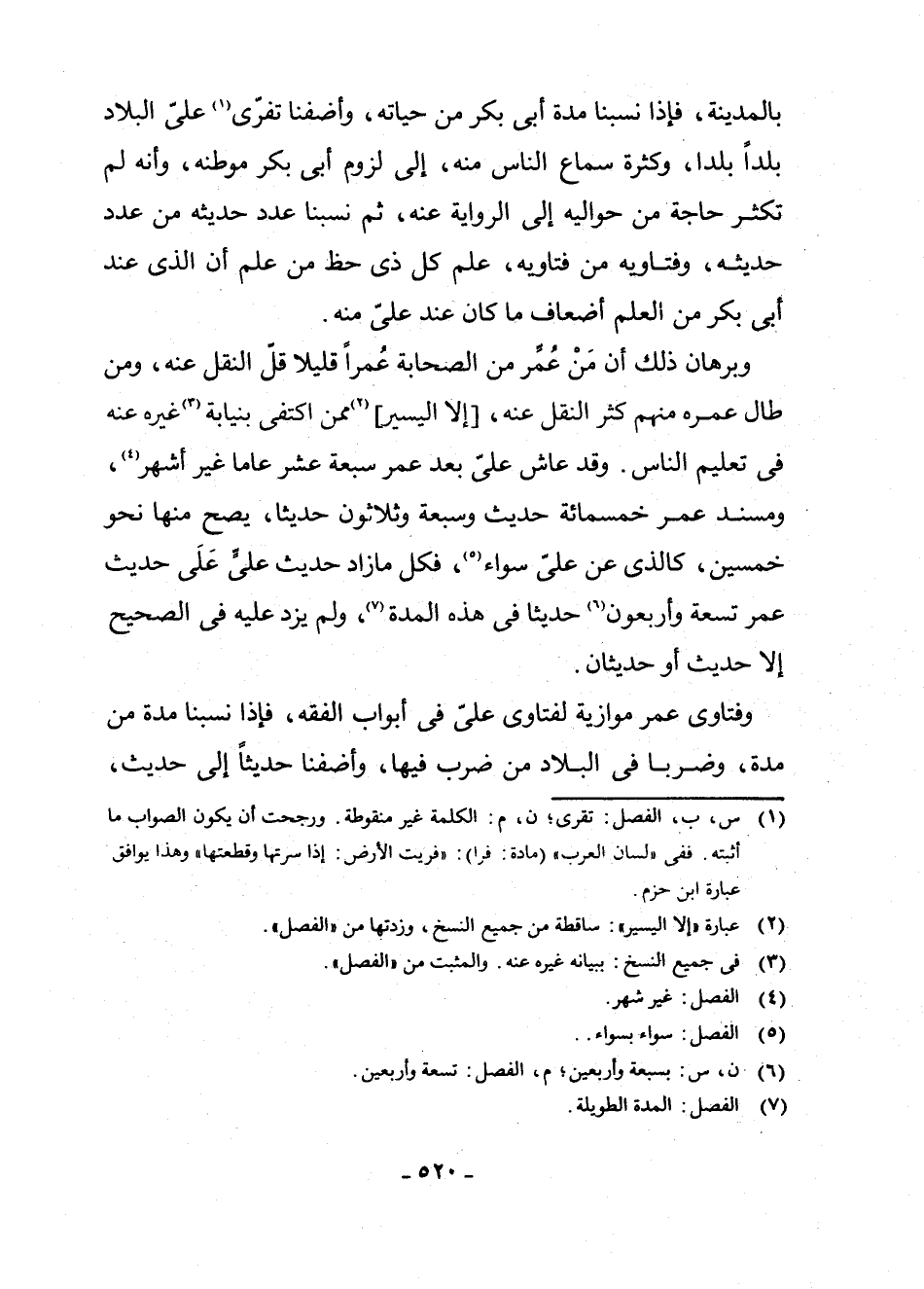 وَبُرْهَانُ ذَلِكَ أَنَّ مَنْ عُمِّرَ مِنَ الصَّحَابَةِ عُمْرًا قَلِيلًا قَلَّ النَّقْلُ عَنْهُ، وَمَنْ طَالَ عُمْرُهُ مِنْهُمْ كَثُرَ النَّقْلُ عَنْهُ (إِلَّا الْيَسِيرَ) (¬2) مِمَّنِ اكْتَفَى بِنِيَابَةِ (¬3) غَيْرِهِ عَنْهُ فِي تَعْلِيمِ النَّاسِ، وَقَدْ عَاشَ عَلِيٌّ بَعْدَ عُمَرَ سَبْعَةَ عَشَرَ عَامًا غَيْرَ أَشْهُرٍ (¬4) ، وَمُسْنَدُ عُمَرَ خَمْسُمِائَةِ حَدِيثٍ وَسَبْعَةٌ وَثَلَاثُونَ حَدِيثًا، يَصِحُّ مِنْهَا نَحْوُ خَمْسِينَ، كَالَّذِي عَنْ عَلِيٍّ سَوَاءٌ (¬5) ، فَكُلُّ مَا زَادَ حَدِيثُ عَلِيٍّ عَلَى حَدِيثِ عُمَرَ تِسْعَةٌ وَأَرْبَعُونَ (¬6) حَدِيثًا فِي هَذِهِ الْمُدَّةِ (¬7) ، وَلَمْ يَزِدْ عَلَيْهِ فِي الصَّحِيحِ إِلَّا حَدِيثٌ أَوْ حَدِيثَانِ.
