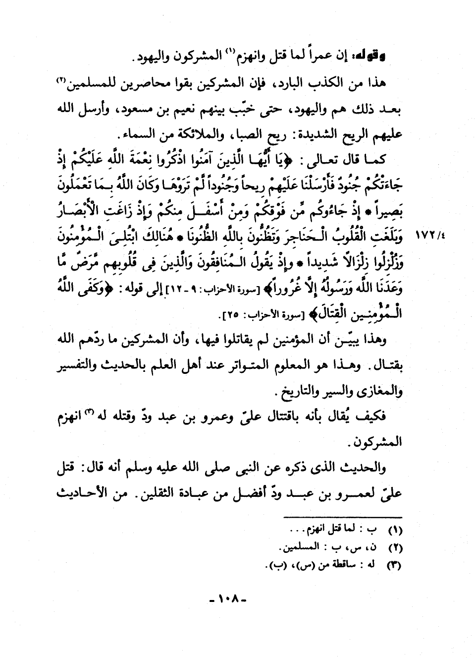 وَهَذَا يُبَيِّنُ أَنَّ الْمُؤْمِنِينَ لَمْ يُقَاتِلُوا فِيهَا، وَأَنَّ الْمُشْرِكِينَ مَا رَدَّهُمُ اللَّهُ بِقِتَالٍ. وَهَذَا هُوَ الْمَعْلُومُ الْمُتَوَاتِرُ عِنْدَ أَهْلِ الْعِلْمِ بِالْحَدِيثِ وَالتَّفْسِيرِ، وَالْمَغَازِي وَالسِّيَرِ، وَالتَّارِيخِ.