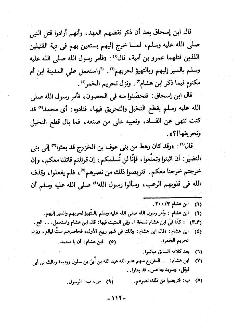 (¬4) ابْنُ هِشَامٍ: " قَالَ ابْنُ هِشَامٍ: وَذَلِكَ فِي شَهْرِ رَبِيعٍ الْأَوَّلِ، فَحَاصَرَهُمْ سِتَّ لَيَالٍ، وَنَزَلَ تَحْرِيمُ الْخَمْرِ ".