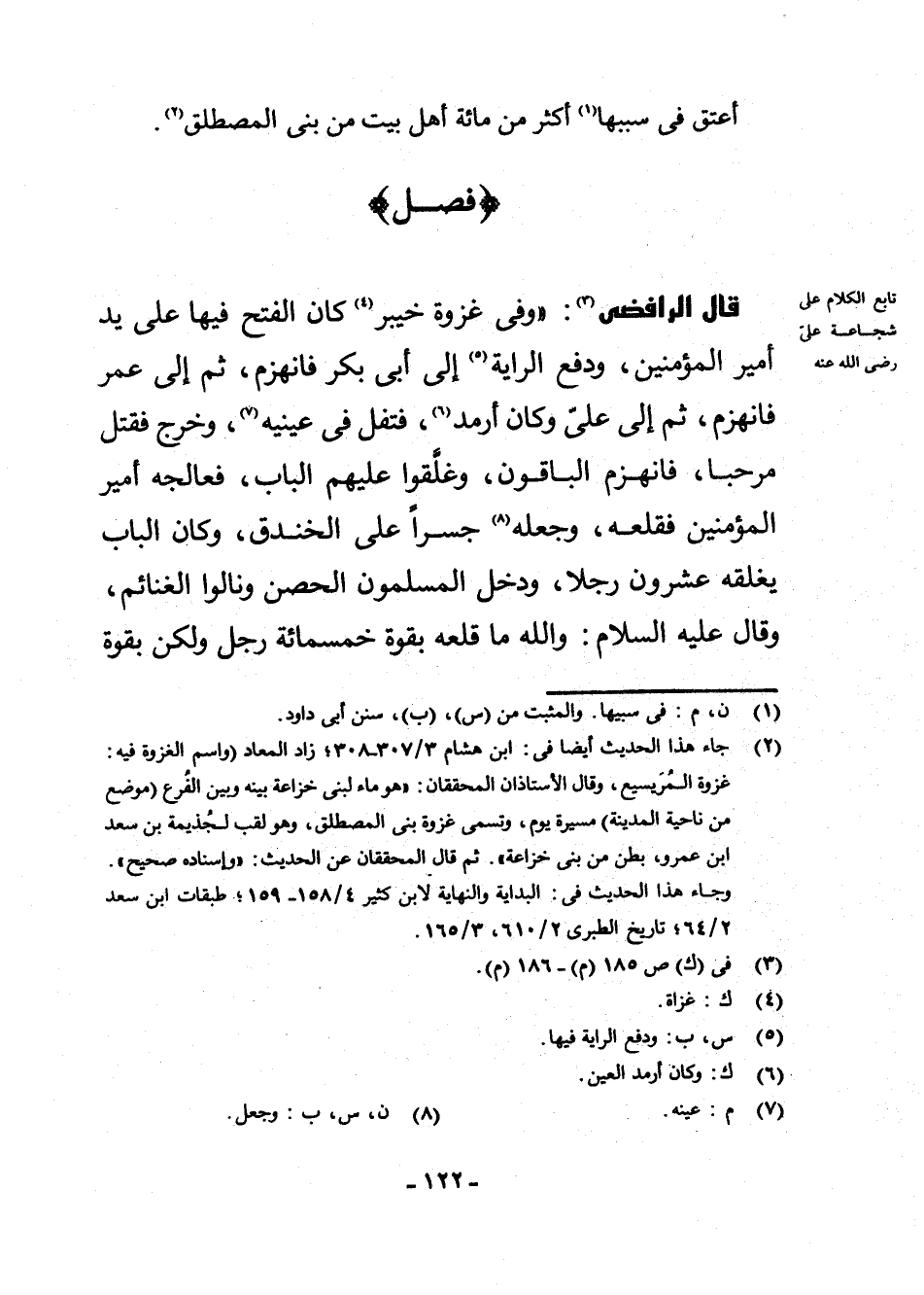 (¬2) جَاءَ هَذَا الْحَدِيثُ أَيْضًا فِي: ابْنِ هِشَامٍ 3/307 - 308، زَادِ الْمَعَادِ (وَاسْمُ الْغَزْوَةِ فِيهِ: غَزْوَةُ الْمُرَيْسِيعِ، وَقَالَ الْأُسْتَاذَانِ الْمُحَقِّقَانِ: " هُوَ مَاءٌ لِبَنِي خُزَاعَةَ بَيْنَهُ وَبَيْنَ الْفُرْعِ (مَوْضِعٌ مِنْ نَاحِيَةِ الْمَدِينَةِ) مَسِيرَةُ يَوْمٍ، وَتُسَمَّى غَزْوَةَ بَنِي الْمُصْطَلِقِ، وَهُوَ لَقَبٌ لِجُذَيْمَةَ بْنِ سَعْدِ بْنِ عَمْرٍو، بَطْنٍ مِنْ بَنِي خُزَاعَةَ ". ثُمَّ قَالَ الْمُحَقِّقَانِ عَنِ الْحَدِيثِ: " وَإِسْنَادُهُ صَحِيحٌ ". وَجَاءَ هَذَا الْحَدِيثُ فِي: الْبِدَايَةِ وَالنِّهَايَةِ لِابْنِ كَثِيرٍ 4/158 - 159 طَبَقَاتِ ابْنِ سَعْدٍ 2/64، تَارِيخِ الطَّبَرِيِّ 2/610، 3/165.