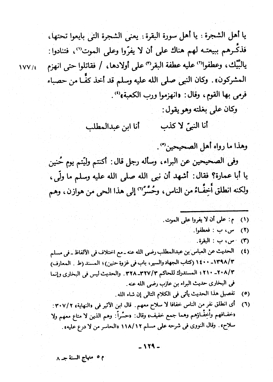 (¬5) الْحَدِيثُ عَنِ الْعَبَّاسِ بْنِ عَبْدِ الْمُطَّلِبِ - رَضِيَ اللَّهُ عَنْهُ - مَعَ اخْتِلَافٍ فِي الْأَلْفَاظِ - فِي مُسْلِمٍ 3/1398 - 1400 (كِتَابُ الْجِهَادِ وَالسِّيَرِ، بَابٌ فِي غَزْوَةِ حُنَيْنٍ) ، الْمُسْنَدِ (ط. الْمَعَارِفِ) 3/208 - 210، الْمُسْتَدْرَكِ لِلْحَاكِمِ 3/327 - 328. وَالْحَدِيثُ لَيْسَ فِي الْبُخَارِيِّ وَإِنَّمَا فِي الْبُخَارِيِّ حَدِيثُ الْبَرَاءِ بْنِ عَازِبٍ - رَضِيَ اللَّهُ عَنْهُ -