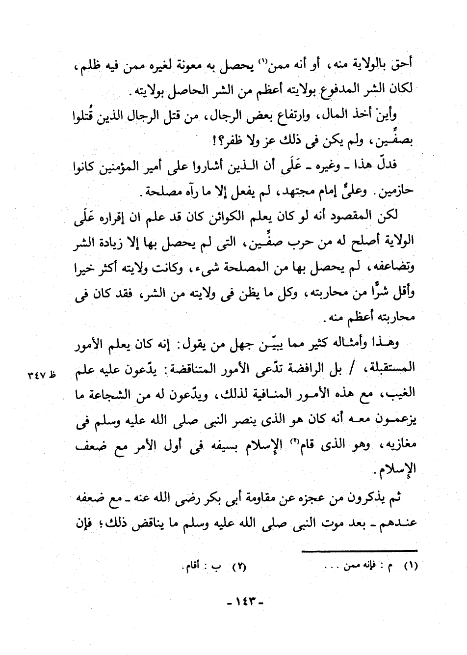 لَكِنَّ الْمَقْصُودَ أَنَّهُ لَوْ كَانَ يَعْلَمُ الْكَوَائِنَ كَانَ قَدْ عَلِمَ أَنَّ إِقْرَارَهُ عَلَى الْوِلَايَةِ أَصْلَحُ لَهُ مِنْ حَرْبِ صِفِّينَ، الَّتِي لَمْ يَحْصُلْ بِهَا إِلَّا زِيَادَةُ الشَّرِّ وَتَضَاعُفُهُ، لَمْ يَحْصُلْ بِهَا مِنَ الْمَصْلَحَةِ شَيْءٌ، وَكَانَتْ وِلَايَتُهُ أَكْثَرَ خَيْرًا وَأَقَلَّ شَرًّا مِنْ مُحَارَبَتِهِ، وَكُلُّ مَا يُظَنُّ فِي وِلَايَتِهِ مِنَ الشَّرِّ، فَقَدْ كَانَ فِي مُحَارَبَتِهِ أَعْظَمُ مِنْهُ.