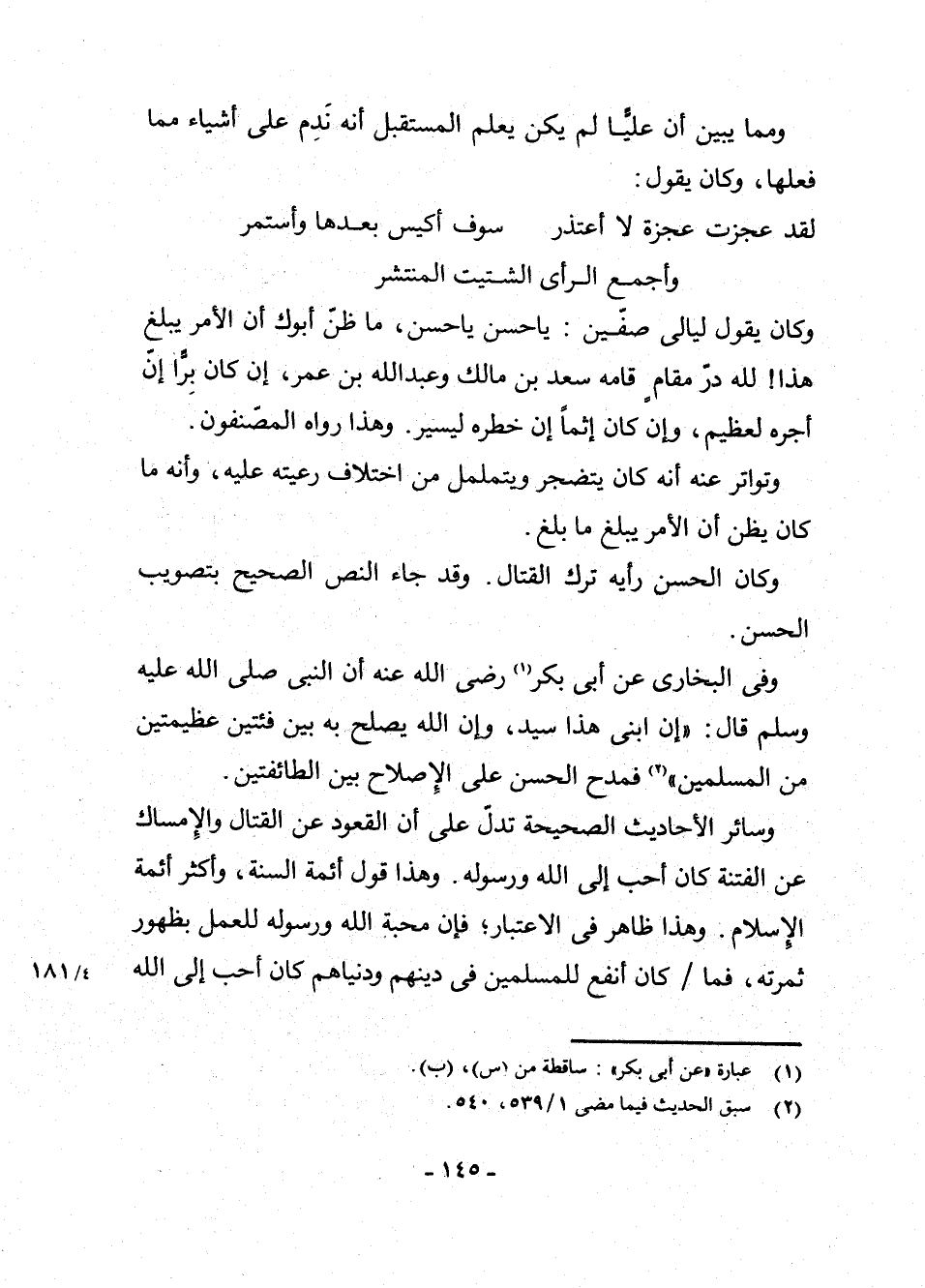 وَفِي الْبُخَارِيِّ عَنْ أَبِي بَكْرٍ (¬1) - رَضِيَ اللَّهُ عَنْهُ - أَنَّ النَّبِيَّ - صَلَّى اللَّهُ عَلَيْهِ وَسَلَّمَ - قَالَ: " «إِنَّ ابْنِي هَذَا سَيِّدٌ، وَإِنَّ اللَّهَ يُصْلِحُ بِهِ بَيْنَ فِئَتَيْنِ عَظِيمَتَيْنِ مِنَ الْمُسْلِمِينَ» " (¬2) . فَمَدَحَ الْحَسَنَ عَلَى الْإِصْلَاحِ بَيْنَ الطَّائِفَتَيْنِ.