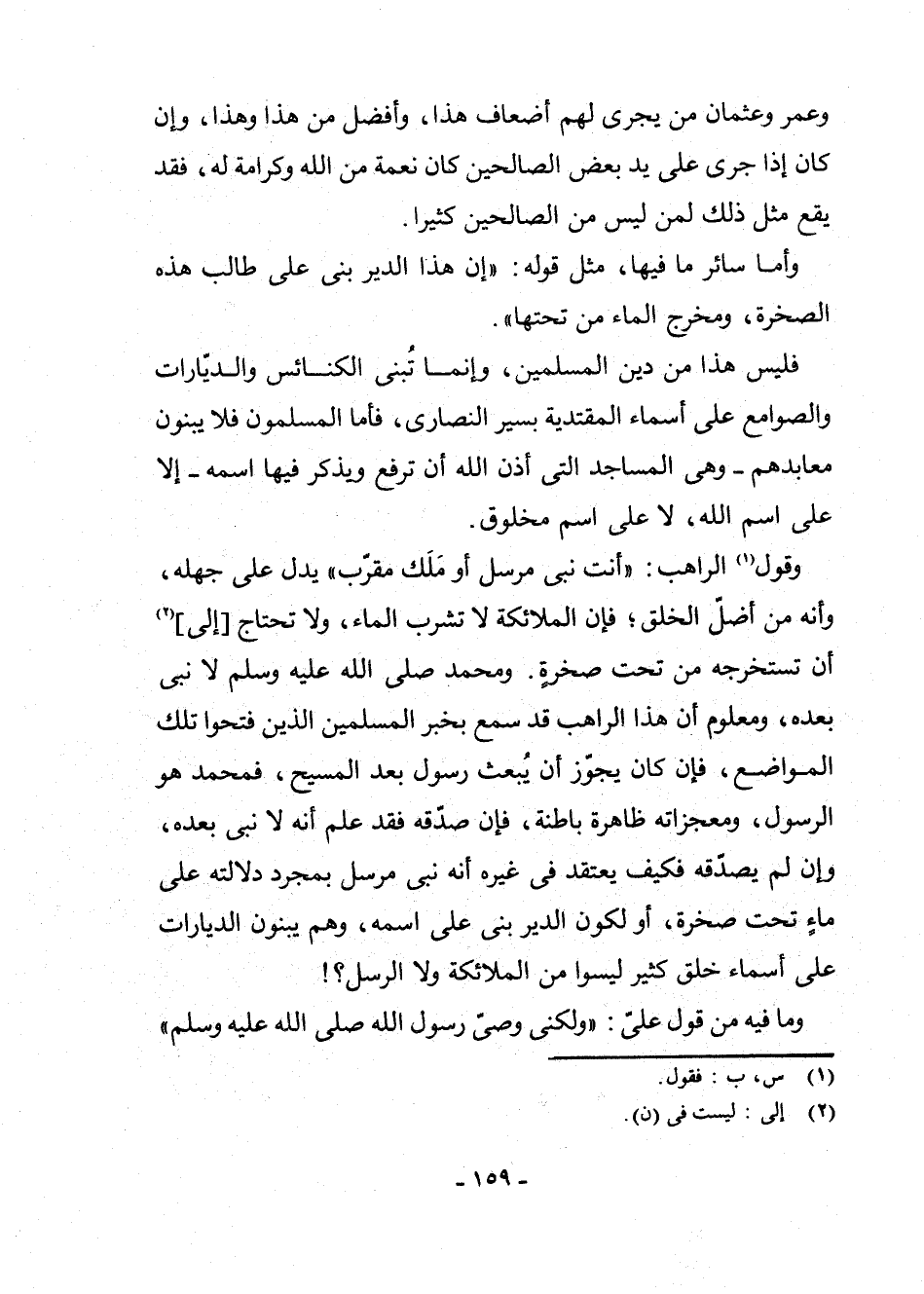 وَقَوْلُ (¬1) الرَّاهِبِ: " أَنْتَ نَبِيٌّ مُرْسَلٌ أَوْ مَلَكٌ مُقَرَّبٌ " يَدُلُّ عَلَى جَهْلِهِ، وَأَنَّهُ مِنْ أَضَلِّ الْخَلْقِ ; فَإِنَّ الْمَلَائِكَةَ لَا تَشْرَبُ الْمَاءَ، وَلَا تَحْتَاجُ [إِلَى] (¬2) أَنْ تَسْتَخْرِجَهُ مِنْ تَحْتِ صَخْرَةٍ. وَمُحَمَّدٌ - صَلَّى اللَّهُ عَلَيْهِ وَسَلَّمَ - لَا نَبِيَّ بَعْدَهُ، وَمَعْلُومٌ أَنَّ هَذَا الرَّاهِبَ قَدْ سَمِعَ بِخَبَرِ الْمُسْلِمِينَ الَّذِينَ فَتَحُوا تِلْكَ الْمَوَاضِعَ، فَإِنْ كَانَ يَجُوزُ أَنْ يُبْعَثَ رَسُولٌ بَعْدَ الْمَسِيحِ، فَمُحَمَّدٌ هُوَ الرَّسُولُ، وَمُعْجِزَاتُهُ ظَاهِرَةٌ بَاطِنَةٌ، فَإِنْ صَدَّقَهُ فَقَدْ عَلِمَ أَنَّهُ لَا نَبِيَّ بَعْدَهُ، وَإِنْ لَمْ يُصَدِّقْهُ فَكَيْفَ يَعْتَقِدُ فِي غَيْرِهِ أَنَّهُ نَبِيٌّ مُرْسَلٌ بِمُجَرَّدِ دَلَالَتِهِ عَلَى مَاءٍ تَحْتَ صَخْرَةٍ، أَوْ لِكَوْنِ الدَّيْرِ بُنِيَ عَلَى اسْمِهِ، وَهُمْ يَبْنُونَ الدَّيَّارَاتِ عَلَى أَسْمَاءِ خَلْقٍ كَثِيرٍ لَيْسُوا مِنَ الْمَلَائِكَةِ وَلَا الرُّسُلِ؟ !