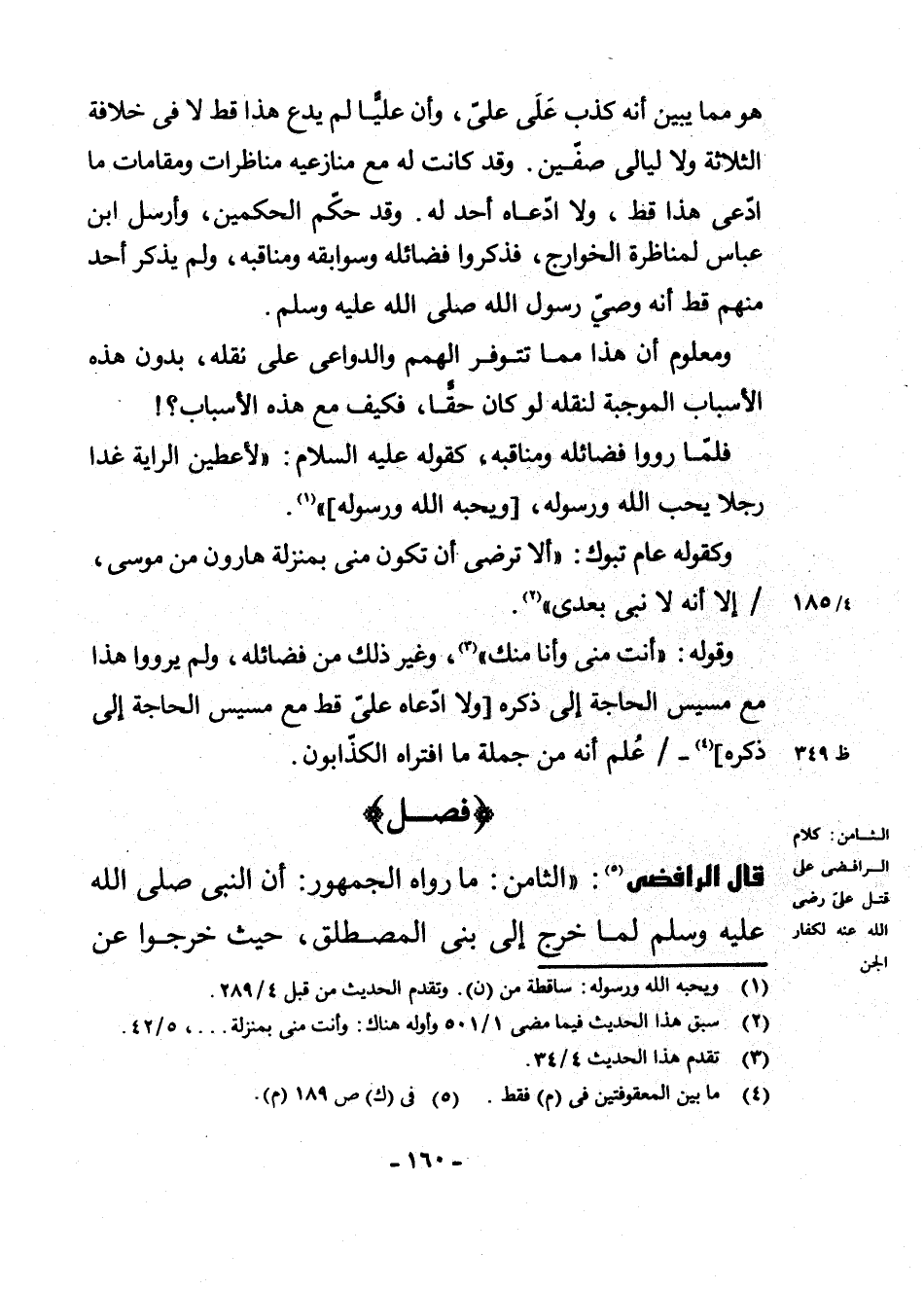 وَقَوْلُهُ: " «أَنْتَ مِنِّي وَأَنَا مِنْكَ» " (¬3) ، وَغَيْرُ ذَلِكَ مِنْ فَضَائِلِهِ، وَلَمْ يَرْوُوا هَذَا مَعَ مَسِيسِ الْحَاجَةِ إِلَى ذِكْرِهِ [وَلَا ادَّعَاهُ عَلِيٌّ قَطُّ مَعَ مَسِيسِ الْحَاجَةِ إِلَى ذِكْرِهِ] (¬4) - عُلِمَ أَنَّهُ مِنْ جُمْلَةِ مَا افْتَرَاهُ الْكَذَّابُونَ.