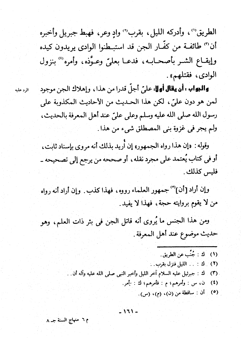 وَالْجَوَابُ: أَنْ يُقَالَ أَوَّلًا: عَلِيٌّ أَجَلُّ قَدْرًا مِنْ هَذَا، وَإِهْلَاكُ الْجِنِّ مَوْجُودٌ لِمَنْ هُوَ دُونَ عَلِيٍّ، لَكِنَّ هَذَا الْحَدِيثَ مِنَ الْأَحَادِيثِ الْمَكْذُوبَةِ عَلَى رَسُولِ اللَّهِ - صَلَّى اللَّهُ عَلَيْهِ وَسَلَّمَ - وَعَلَى عَلِيٍّ عِنْدَ أَهْلِ الْمَعْرِفَةِ بِالْحَدِيثِ، وَلَمْ يَجْرِ فِي غَزْوَةِ بَنِي الْمُصْطَلِقِ شَيْءٌ مِنْ هَذَا.