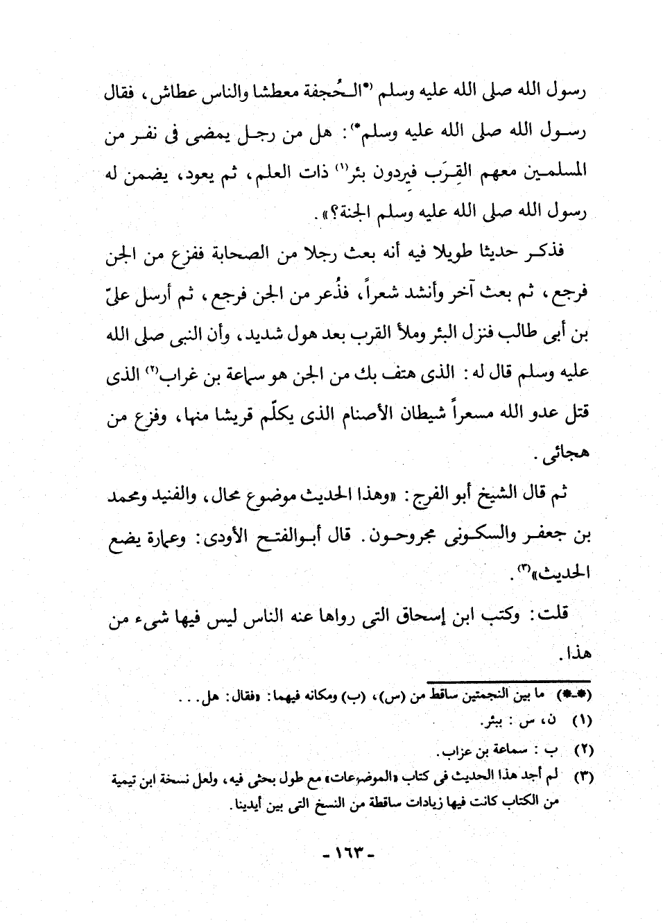 فَذَكَرَ حَدِيثًا طَوِيلًا فِيهِ أَنَّهُ بَعَثَ رَجُلًا مِنَ الصَّحَابَةِ فَفَزِعَ مِنَ الْجِنِّ فَرَجَعَ، ثُمَّ بَعَثَ آخَرَ وَأَنْشَدَ شِعْرًا، فَذُعِرَ مِنَ الْجِنِّ فَرَجَعَ، ثُمَّ أَرْسَلَ عَلِيَّ بْنَ أَبِي طَالِبٍ فَنَزَلَ الْبِئْرَ وَمَلَأَ الْقِرَبَ بَعْدَ هَوْلٍ شَدِيدٍ، وَأَنَّ النَّبِيَّ - صَلَّى اللَّهُ عَلَيْهِ وَسَلَّمَ - قَالَ لَهُ: الَّذِي هَتَفَ بِكَ مِنَ الْجِنِّ هُوَ سَمَاعَةُ بْنُ غُرَابٍ (¬3) الَّذِي قَتَلَ عَدُوَّ اللَّهِ مِسْعَرًا شَيْطَانَ الْأَصْنَامِ الَّذِي يُكَلِّمُ قُرَيْشًا مِنْهَا، وَفَزِعَ مِنْ هِجَائِي» .