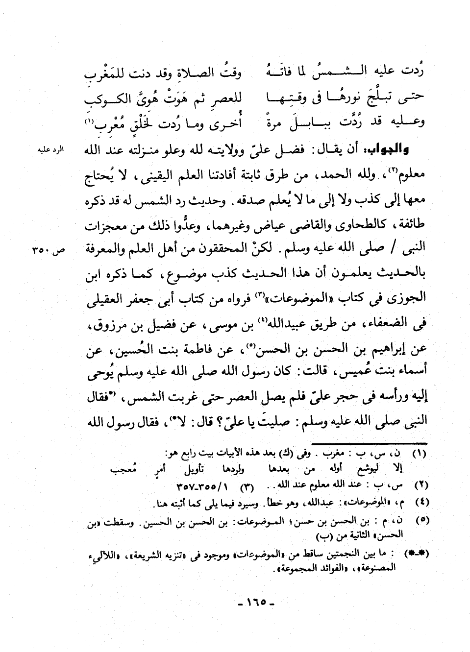 وَالْجَوَابُ: أَنْ يُقَالَ: فَضْلُ عَلِيٍّ وَوِلَايَتُهُ لِلَّهِ وَعُلُوُّ مَنْزِلَتِهِ عِنْدَ اللَّهِ مَعْلُومٌ (¬2) ، وَلِلَّهِ الْحَمْدُ، مِنْ طُرُقٍ ثَابِتَةٍ أَفَادَتْنَا الْعِلْمَ الْيَقِينِيَّ، لَا يُحْتَاجُ مَعَهَا إِلَى كَذِبٍ وَلَا إِلَى مَا لَا يُعْلَمُ صِدْقُهُ. وَحَدِيثُ رَدِّ الشَّمْسِ لَهُ قَدْ ذَكَرَهُ طَائِفَةٌ، كَالطَّحَاوِيِّ، وَالْقَاضِي عِيَاضٍ، وَغَيْرِهِمَا، وَعَدُّوا ذَلِكَ مِنْ مُعْجِزَاتِ النَّبِيِّ - صَلَّى اللَّهُ عَلَيْهِ وَسَلَّمَ. لَكِنِ الْمُحَقِّقُونَ مِنْ أَهْلِ الْعِلْمِ وَالْمَعْرِفَةِ بِالْحَدِيثِ يَعْلَمُونَ أَنَّ هَذَا الْحَدِيثَ كَذِبٌ مَوْضُوعٌ، كَمَا ذَكَرَهُ ابْنُ الْجَوْزِيِّ فِي كِتَابِ " الْمَوْضُوعَاتِ " (¬3) فَرَوَاهُ مِنْ كِتَابِ أَبِي جَعْفَرٍ الْعُقَيْلِيِّ فِي الضُّعَفَاءِ، مِنْ طَرِيقِ عُبَيْدِ اللَّهِ (¬4) بْنِ مُوسَى، عَنْ فُضَيْلِ بْنِ مَرْزُوقٍ، عَنْ إِبْرَاهِيمَ بْنِ الْحَسَنِ بْنِ الْحَسَنِ (¬5) ، عَنْ فَاطِمَةَ بِنْتِ الْحُسَيْنِ، عَنْ أَسْمَاءَ بِنْتِ عُمَيْسٍ، قَالَتْ: " «كَانَ رَسُولُ اللَّهِ - صَلَّى اللَّهُ عَلَيْهِ وَسَلَّمَ - يُوحَى إِلَيْهِ وَرَأْسُهُ فِي حِجْرِ عَلِيٍّ فَلَمْ يُصَلِّ الْعَصْرَ حَتَّى غَرَبَتِ الشَّمْسُ، (* فَقَالَ النَّبِيُّ - صَلَّى اللَّهُ عَلَيْهِ وَسَلَّمَ: صَلَّيْتَ يَا عَلِيُّ؟ قَالَ: لَا *) (¬6) . فَقَالَ رَسُولُ اللَّهِ