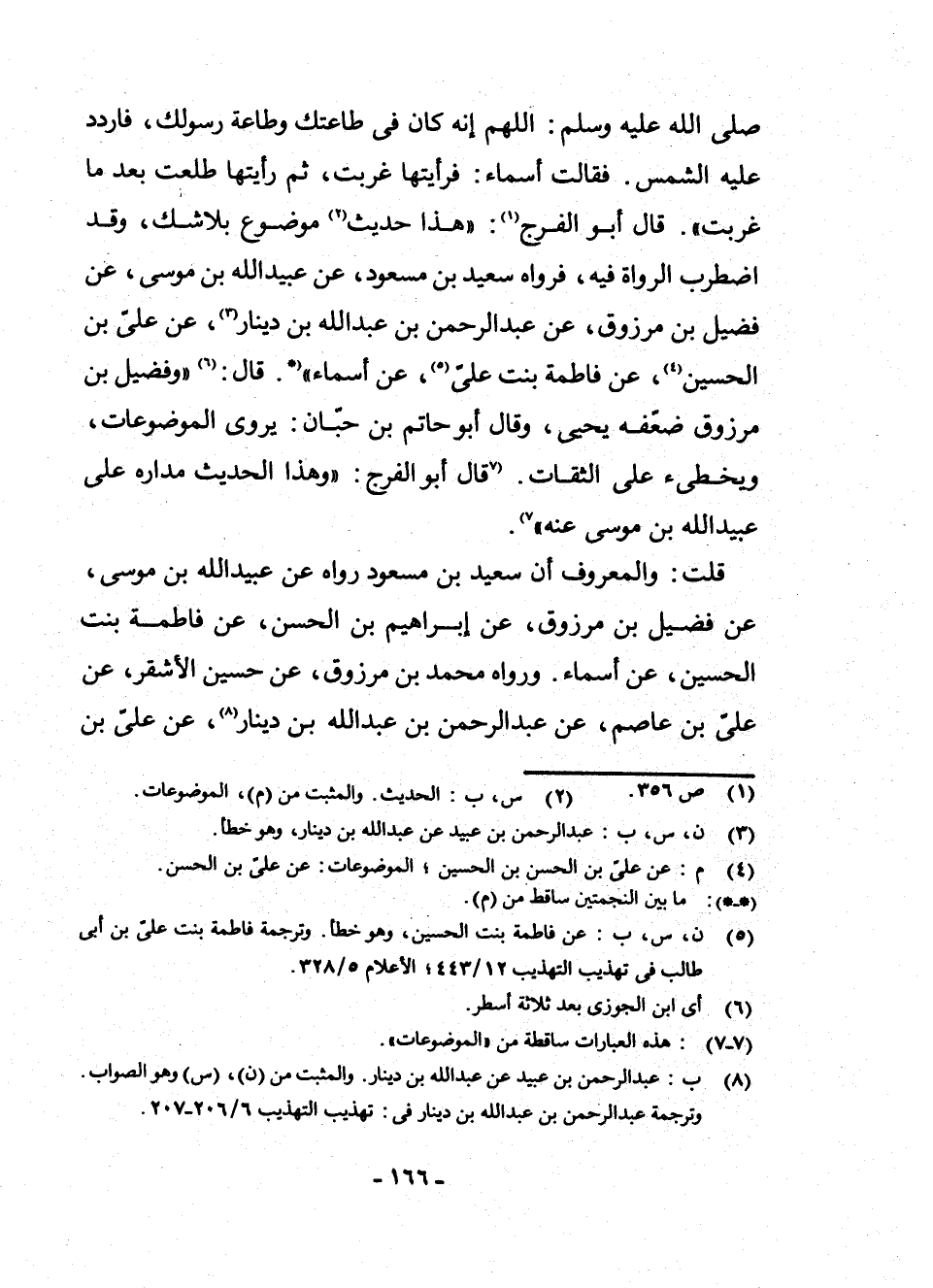 - صَلَّى اللَّهُ عَلَيْهِ وَسَلَّمَ: اللَّهُمَّ إِنَّهُ كَانَ فِي طَاعَتِكَ وَطَاعَةِ رَسُولِكَ، فَارْدُدْ عَلَيْهِ الشَّمْسَ. فَقَالَتْ أَسْمَاءُ: فَرَأَيْتُهَا غَرَبَتْ، ثُمَّ رَأَيْتُهَا طَلَعَتْ بَعْدَ مَا غَرَبَتْ» ". قَالَ أَبُو الْفَرَجِ (¬1) : " وَهَذَا حَدِيثٌ (¬2) مَوْضُوعٌ بِلَا شَكٍّ، وَقَدِ اضْطَرَبَ الرُّوَاةُ فِيهِ، فَرَوَاهُ سَعِيدُ بْنُ مَسْعُودٍ، عَنْ عُبَيْدِ اللَّهِ بْنِ مُوسَى، عَنْ فُضَيْلِ بْنِ مَرْزُوقٍ، عَنْ عَبْدِ الرَّحْمَنِ بْنِ عَبْدِ اللَّهِ بْنِ دِينَارٍ (¬3) ، عَنْ عَلِيِّ بْنِ الْحُسَيْنِ (¬4) ، عَنْ فَاطِمَةَ بِنْتِ عَلِيٍّ (¬5) ، عَنْ أَسْمَاءَ ". قَالَ: (¬6) " وَفُضَيْلُ بْنُ مَرْزُوقٍ ضَعَّفَهُ يَحْيَى، وَقَالَ أَبُو حَاتِمِ بْنُ حِبَّانَ: يَرْوِي الْمَوْضُوعَاتِ، وَيُخْطِئُ عَلَى الثِّقَاتِ. قَالَ أَبُو الْفَرَجِ: " وَهَذَا الْحَدِيثُ مَدَارُهُ عَلَى عُبَيْدِ اللَّهِ بْنِ مُوسَى عَنْهُ " (¬7) .
