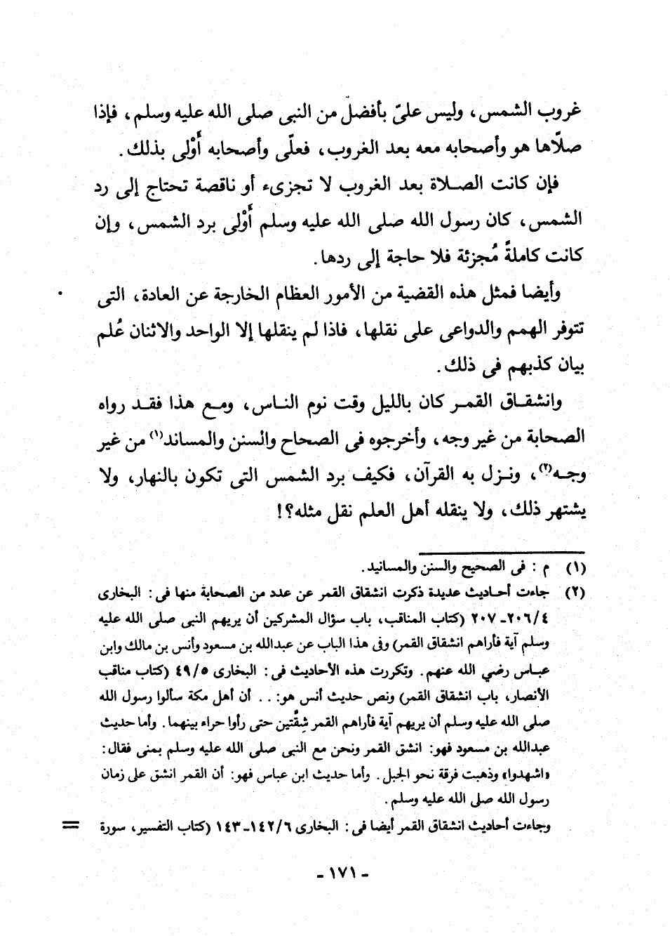 وَانْشِقَاقُ الْقَمَرِ كَانَ بِاللَّيْلِ وَقْتَ نَوْمِ النَّاسِ، وَمَعَ هَذَا فَقَدْ رَوَاهُ الصَّحَابَةُ مِنْ غَيْرِ وَجْهٍ، وَأَخْرَجُوهُ فِي الصِّحَاحِ وَالسُّنَنِ وَالْمَسَانِدِ (¬1) مِنْ غَيْرِ وَجْهٍ (¬2) ، وَنَزَلَ بِهِ الْقُرْآنُ، فَكَيْفَ بِرَدِّ الشَّمْسِ الَّتِي تَكُونُ بِالنَّهَارِ، وَلَا يَشْتَهِرُ ذَلِكَ، وَلَا يَنْقُلُهُ أَهْلُ الْعِلْمِ نَقْلَ مِثْلِهِ؟ !