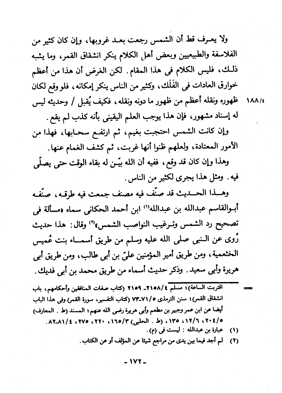 وَلَا يُعْرَفُ قَطُّ أَنَّ الشَّمْسَ رَجَعَتْ بَعْدَ غُرُوبِهَا، وَإِنْ كَانَ كَثِيرٌ مِنَ الْفَلَاسِفَةِ وَالطَّبِيعِيِّينَ وَبَعْضِ أَهْلِ الْكَلَامِ يُنْكِرُ انْشِقَاقَ الْقَمَرِ، وَمَا يُشْبِهُ ذَلِكَ، فَلَيْسَ الْكَلَامُ فِي هَذَا الْمَقَامِ. لَكِنَّ الْغَرَضَ أَنَّ هَذَا مِنْ أَعْظَمِ خَوَارِقِ الْعَادَاتِ فِي الْفَلَكِ، وَكَثِيرٌ مِنَ النَّاسِ يُنْكِرُ إِمْكَانَهُ، فَلَوْ وَقَعَ لَكَانَ ظُهُورُهُ وَنَقْلُهُ أَعْظَمَ مِنْ ظُهُورِ مَا دُونَهُ وَنَقْلِهِ، فَكَيْفَ يُقْبَلُ وَحَدِيثُهُ لَيْسَ لَهُ إِسْنَادٌ مَشْهُورٌ؟ فَإِنَّ هَذَا يُوجِبُ الْعِلْمَ الْيَقِينِيَّ بِأَنَّهُ كَذِبٌ لَمْ يَقَعْ.