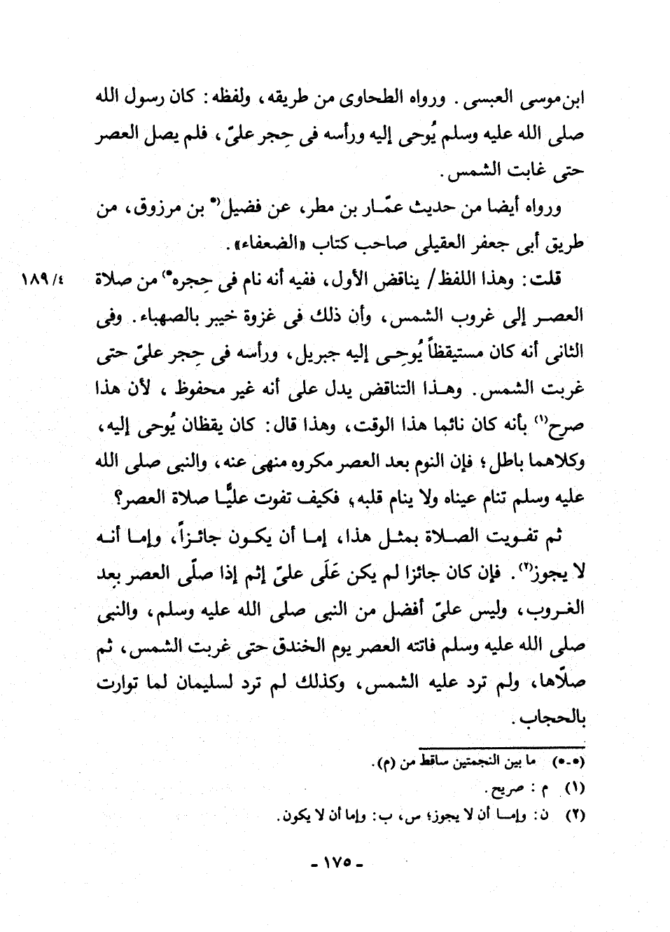 قُلْتُ: وَهَذَا اللَّفْظُ يُنَاقِضُ الْأَوَّلَ، فَفِيهِ أَنَّهُ نَامَ فِي حِجْرِهِ *) (¬1) مِنْ صَلَاةِ الْعَصْرِ إِلَى غُرُوبِ الشَّمْسِ، وَأَنَّ ذَلِكَ فِي غَزْوَةِ خَيْبَرَ بِالصَّهْبَاءِ. وَفِي الثَّانِي أَنَّهُ كَانَ مُسْتَيْقِظًا يُوحِي إِلَيْهِ جِبْرِيلُ، وَرَأْسُهُ فِي حِجْرِ عَلِيٍّ حَتَّى غَرَبَتِ الشَّمْسُ. وَهَذَا التَّنَاقُضُ يَدُلُّ عَلَى أَنَّهُ غَيْرُ مَحْفُوظٍ ; لِأَنَّ هَذَا صَرَّحَ (¬2) بِأَنَّهُ كَانَ نَائِمًا هَذَا الْوَقْتَ، وَهَذَا قَالَ: كَانَ يَقْظَانَ يُوحَى إِلَيْهِ، وَكِلَاهُمَا بَاطِلٌ ; فَإِنَّ النَّوْمَ بَعْدَ الْعَصْرِ مَكْرُوهٌ مَنْهِيٌّ عَنْهُ، وَالنَّبِيُّ - صَلَّى اللَّهُ عَلَيْهِ وَسَلَّمَ - تَنَامُ عَيْنَاهُ وَلَا يَنَامُ قَلْبُهُ، فَكَيْفَ تَفُوتُ عَلِيًّا صَلَاةُ الْعَصْرِ؟