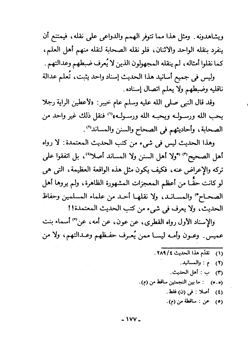 وَهَذَا الْحَدِيثُ لَيْسَ فِي شَيْءٍ مِنْ كُتُبِ الْحَدِيثِ الْمُعْتَمَدَةِ: (* لَا رَوَاهُ أَهْلُ الصَّحِيحِ (¬3) وَلَا أَهْلُ السُّنَنِ وَلَا الْمَسَانِدِ أَصْلًا (¬4) ، بَلِ اتَّفَقُوا عَلَى تَرْكِهِ وَالْإِعْرَاضِ عَنْهُ، فَكَيْفَ يَكُونُ مِثْلُ هَذِهِ الْوَاقِعَةِ الْعَظِيمَةِ، الَّتِي هِيَ لَوْ كَانَتْ حَقًّا مِنْ أَعْظَمِ الْمُعْجِزَاتِ الْمَشْهُورَةِ الظَّاهِرَةِ، وَلَمْ يَرْوِهَا أَهْلُ الصِّحَاحِ *) (¬5) وَالْمَسَانِدِ، وَلَا نَقَلَهَا أَحَدٌ مِنْ عُلَمَاءِ الْمُسْلِمِينَ وَحُفَّاظِ الْحَدِيثِ، وَلَا يُعْرَفُ فِي شَيْءٍ مِنْ كُتُبِ الْحَدِيثِ الْمُعْتَمَدَةِ! !