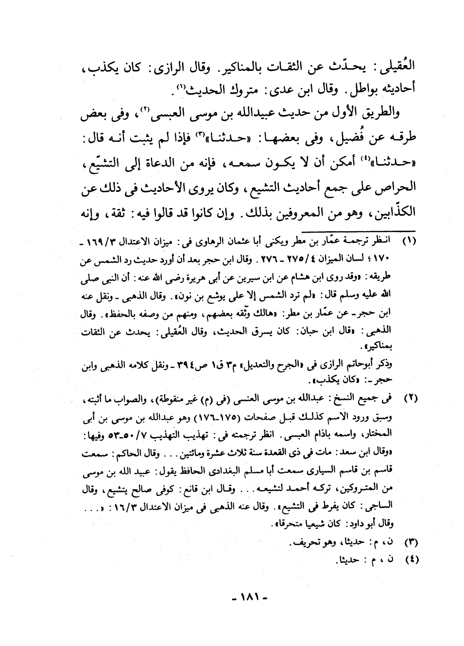 - 53 وَفِيهَا: " وَقَالَ ابْنُ سَعْدٍ: مَاتَ فِي ذِي الْقَعْدَةِ سَنَةَ ثَلَاثَ عَشْرَةَ وَمِائَتَيْنِ. . . وَقَالَ الْحَاكِمُ: سَمِعْتُ قَاسِمَ بْنَ قَاسِمٍ السَّيَّارِيَّ سَمِعْتُ أَبَا مُسْلِمٍ الْبَغْدَادِيَّ الْحَافِظَ يَقُولُ: عُبَيْدُ اللَّهِ بْنُ مُوسَى مِنَ الْمَتْرُوكِينَ، تَرَكَهُ أَحْمَدُ لِتَشَيُّعِهِ. . . وَقَالَ ابْنُ قَانِعٍ: كُوفِيٌّ صَالِحٌ يَتَشَيَّعُ، وَقَالَ السَّاجِيُّ: كَانَ يُفْرِطُ فِي التَّشَيُّعِ: وَقَالَ عَنْهُ الذَّهَبِيُّ فِي مِيزَانِ الِاعْتِدَالِ 3/16: ". . . وَقَالَ أَبُو دَاوُدَ: كَانَ شِيعِيًّا مُتَحَرِّقًا ".