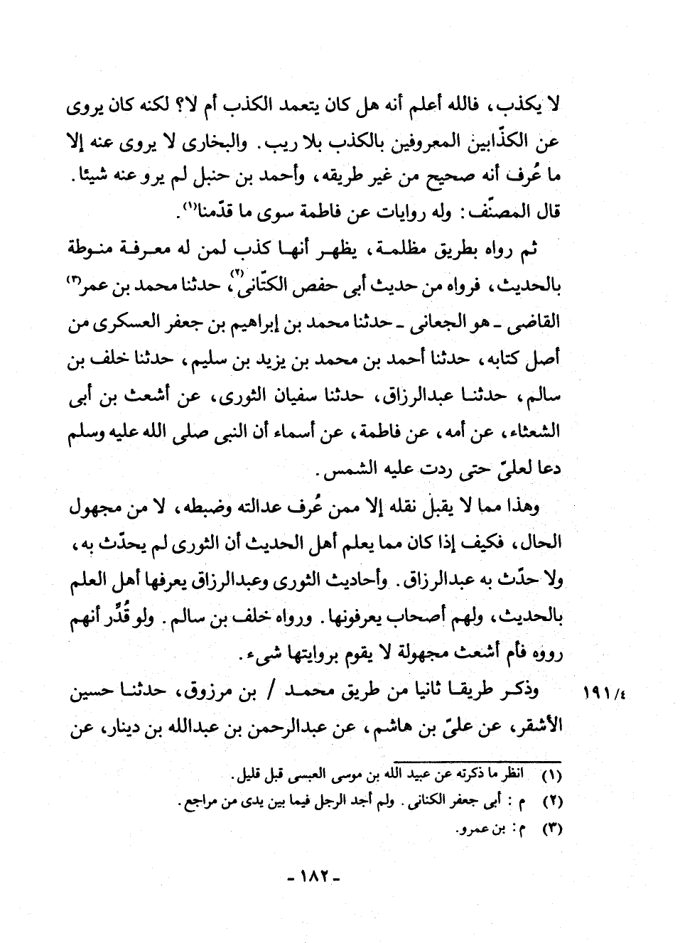 ثُمَّ رَوَاهُ بِطَرِيقٍ مُظْلِمَةٍ، يَظْهَرُ أَنَّهَا كَذِبٌ لِمَنْ لَهُ مَعْرِفَةٌ مَنُوطَةٌ بِالْحَدِيثِ، فَرَوَاهُ مِنْ حَدِيثِ أَبِي حَفْصٍ الْكَتَّانِيِّ (¬2) ، حَدَّثَنَا مُحَمَّدُ بْنُ عُمَرَ (¬3) الْقَاضِي - هُوَ الْجَعَّانِيُّ - حَدَّثَنَا مُحَمَّدُ بْنُ إِبْرَاهِيمَ بْنِ جَعْفَرٍ الْعَسْكَرِيُّ مِنْ أَصْلِ كِتَابِهِ، حَدَّثَنَا أَحْمَدُ بْنُ مُحَمَّدِ بْنِ يَزِيدَ بْنِ سُلَيْمٍ، حَدَّثَنَا خَلَفُ بْنُ سَالِمٍ، حَدَّثَنَا عَبْدُ الرَّزَّاقِ، حَدَّثَنَا سُفْيَانُ الثَّوْرِيُّ، عَنْ أَشْعَثَ بْنِ أَبِي الشَّعْثَاءِ، عَنْ أُمِّهِ، عَنْ فَاطِمَةَ، عَنْ أَسْمَاءَ «أَنَّ النَّبِيَّ - صَلَّى اللَّهُ عَلَيْهِ وَسَلَّمَ - دَعَا لِعَلِيٍّ حَتَّى رُدَّتْ عَلَيْهِ الشَّمْسُ» .