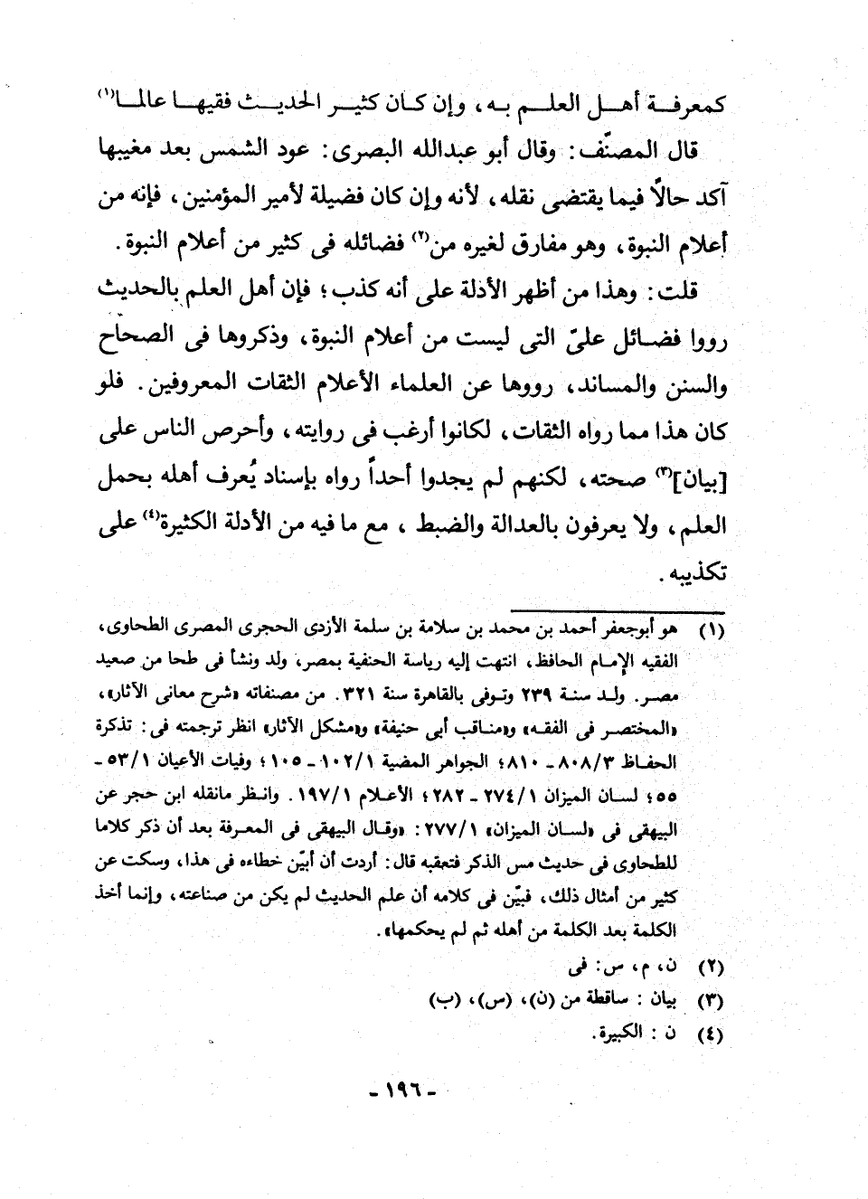 (¬1) هُوَ أَبُو جَعْفَرٍ أَحْمَدُ بْنُ مُحَمَّدِ بْنِ سَلَامَةَ بْنِ سَلَمَةَ الْأَزْدِيُّ الْحَجَرِيُّ الْمِصْرِيُّ الطَّحَاوِيُّ، الْفَقِيهُ الْإِمَامُ الْحَافِظُ، انْتَهَتْ إِلَيْهِ رِيَاسَةُ الْحَنَفِيَّةِ بِمِصْرَ، وُلِدَ وَنَشَأَ فِي طَحَا مِنْ صَعِيدِ مِصْرَ. وُلِدَ سَنَةَ 239 وَتُوُفِّيَ بِالْقَاهِرَةِ سَنَةَ 321. مِنْ مُصَنَّفَاتِهِ " شَرْحُ مَعَانِي الْآثَارِ "، الْمُخْتَصَرُ فِي الْفِقْهِ " وَ " مَنَاقِبُ أَبِي حَنِيفَةَ " وَ " مُشْكِلُ الْآثَارِ " انْظُرْ تَرْجَمَتَهُ فِي: تَذْكِرَةِ الْحُفَّاظِ 3/808 - 810، الْجَوَاهِرِ الْمُضِيئَةِ 1/102 - 105 وَفَيَاتِ الْأَعْيَانِ 1/53 - 55، لِسَانِ الْمِيزَانِ 1/274 - 282، الْأَعْلَامِ 1/197. وَانْظُرْ مَا نَقَلَهُ ابْنُ حَجَرٍ عَنِ الْبَيْهَقِيِّ فِي " لِسَانِ الْمِيزَانِ " 1/277: " وَقَالَ الْبَيْهَقِيُّ فِي الْمَعْرِفَةِ بَعْدَ أَنْ ذَكَرَ كَلَامًا لِلطَّحَاوِيِّ فِي حَدِيثِ مَسِّ الذَّكَرِ فَتَعَقَّبَهُ قَالَ: أَرَدْتُ أَنْ أُبَيِّنَ خَطَأَهُ فِي هَذَا، وَسَكَتَ عَنْ كَثِيرٍ مِنْ أَمْثَالِ ذَلِكَ، فَبَيَّنَ فِي كَلَامِهِ أَنَّ عِلْمَ الْحَدِيثِ لَمْ يَكُنْ مِنْ صِنَاعَتِهِ، وَإِنَّمَا أَخَذَ الْكَلِمَةَ بَعْدَ الْكَلِمَةِ مِنْ أَهْلِهِ ثُمَّ لَمْ يُحْكِمْهَا ".