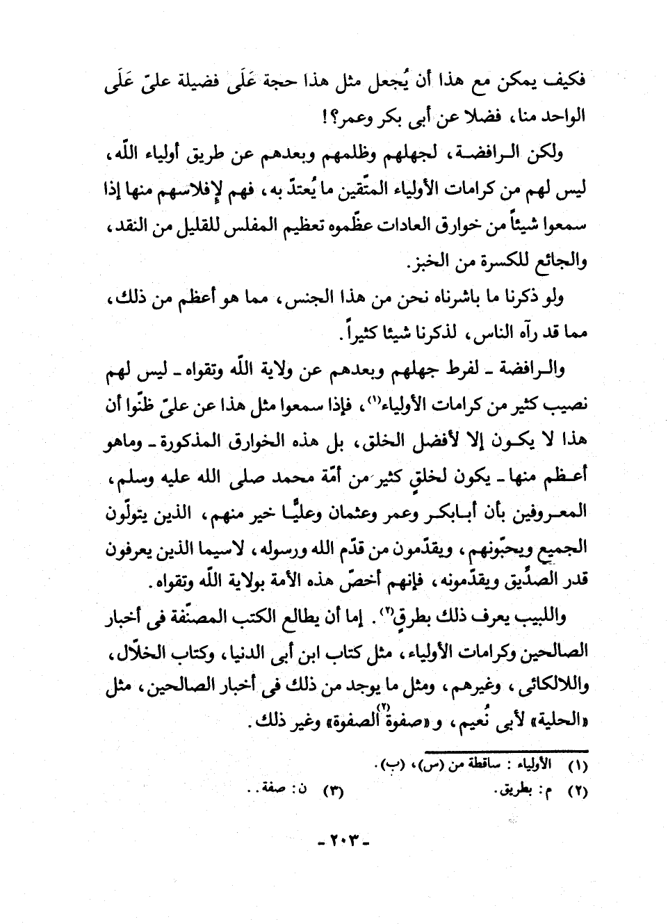 وَلَكِنَّ الرَّافِضَةَ - لِجَهْلِهِمْ وَظُلْمِهِمْ وَبُعْدِهِمْ عَنْ طَرِيقِ أَوْلِيَاءِ اللَّهِ - لَيْسَ لَهُمْ مِنْ كَرَامَاتِ الْأَوْلِيَاءِ الْمُتَّقِينَ مَا يُعْتَدُّ بِهِ، فَهُمْ لِإِفْلَاسِهِمْ مِنْهَا إِذَا سَمِعُوا شَيْئًا مِنْ خَوَارِقِ الْعَادَاتِ عَظَّمُوهُ تَعْظِيمَ الْمُفْلِسِ لِلْقَلِيلِ مِنَ النَّقْدِ، وَالْجَائِعِ لِلْكِسْرَةِ مِنَ الْخُبْزِ.