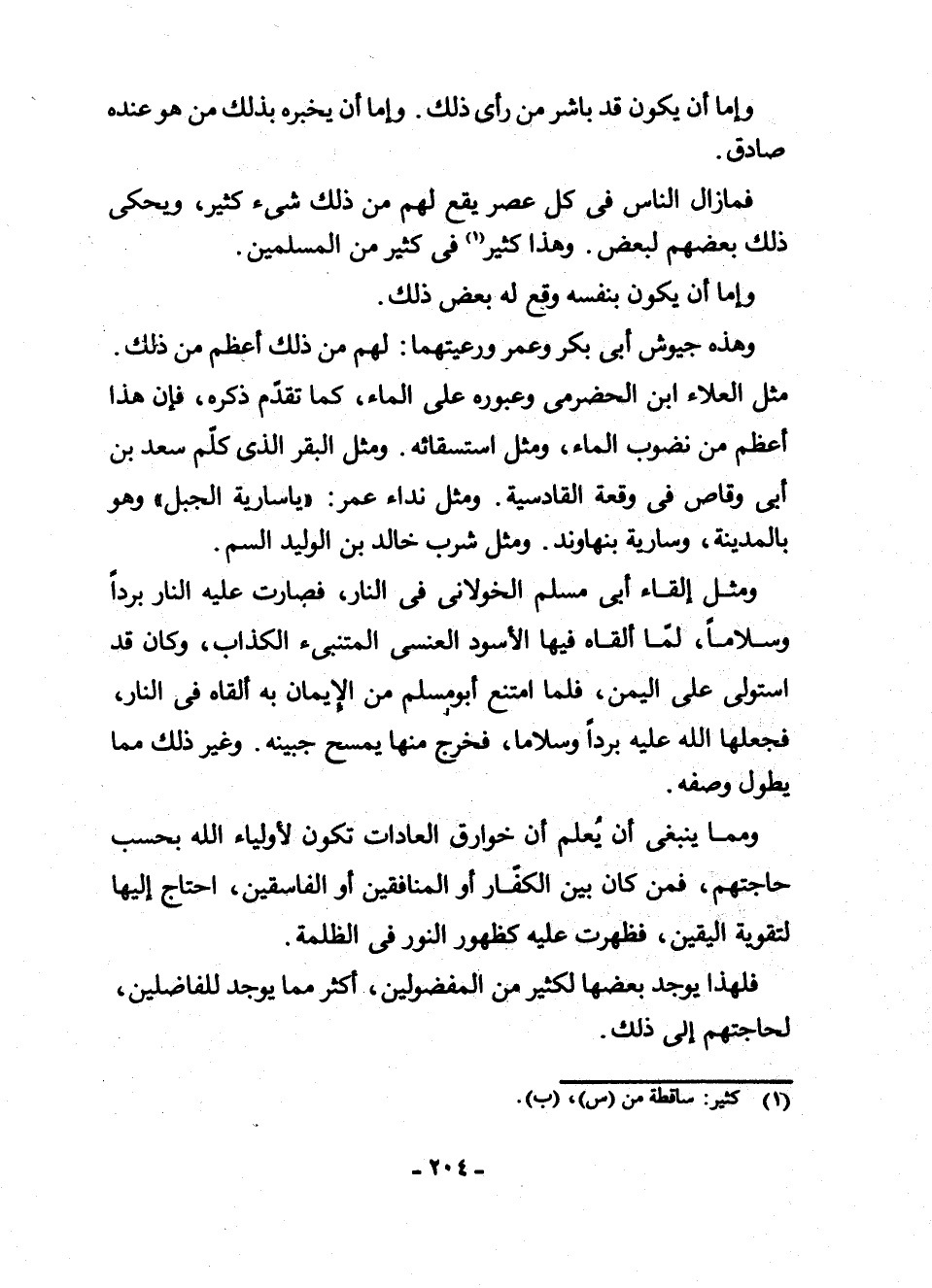 وَهَذِهِ جُيُوشُ أَبِي بَكْرٍ وَعُمَرَ وَرَعِيَّتُهَا: لَهُمْ مِنْ ذَلِكَ أَعْظَمُ مِنْ ذَلِكَ. مِثْلَ الْعَلَاءِ بْنِ الْحَضْرَمِيِّ وَعُبُورِهِ عَلَى الْمَاءِ، كَمَا تَقَدَّمَ ذِكْرُهُ، فَإِنَّ هَذَا أَعْظَمُ مِنْ نُضُوبِ الْمَاءِ، وَمِثْلَ اسْتِقَائِهِ، وَمِثْلَ الْبَقَرِ الَّذِي كَلَّمَ سَعْدَ بْنَ أَبِي وَقَّاصٍ فِي وَقْعَةِ الْقَادِسِيَّةِ، وَمِثْلَ نِدَاءِ عُمَرَ: " يَا سَارِيَةُ الْجَبَلَ " وَهُوَ بِالْمَدِينَةِ، وَسَارِيَةُ بِنَهَاوَنْدَ، وَمِثْلَ شُرْبِ خَالِدِ بْنِ الْوَلِيدِ السُّمَّ.