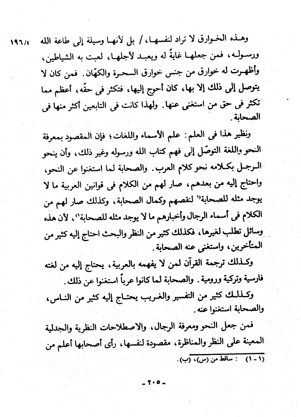 وَنَظِيرُ هَذَا فِي الْعِلْمِ: عِلْمُ الْأَسْمَاءِ وَاللُّغَاتِ: فَإِنَّ الْمَقْصُودَ بِمَعْرِفَةِ النَّحْوِ وَاللُّغَةِ التَّوَصُّلُ إِلَى فَهْمِ كِتَابِ اللَّهِ وَرَسُولِهِ وَغَيْرِ ذَلِكَ، وَأَنْ يَنْحُوَ الرَّجُلُ بِكَلَامِهِ نَحْوَ كَلَامِ الْعَرَبِ. وَالصَّحَابَةُ لَمَّا اسْتَغْنَوْا عَنِ النَّحْوِ وَاحْتَاجَ إِلَيْهِ مَنْ بَعْدَهُمْ، صَارَ لَهُمْ مِنَ الْكَلَامِ فِي قَوَانِينِ الْعَرَبِيَّةِ مَا لَا يُوجَدُ مِثْلُهُ لِلصَّحَابَةِ ; لِنَقْصِهِمْ وَكَمَالِ الصَّحَابَةِ، وَكَذَلِكَ صَارَ لَهُمْ مِنَ الْكَلَامِ فِي أَسْمَاءِ الرِّجَالِ وَأَخْبَارِهِمْ مَا لَا يُوجَدُ مِثْلُهُ لِلصَّحَابَةِ (¬1) ; لِأَنَّ هَذِهِ وَسَائِلُ تُطْلَبُ لِغَيْرِهَا، فَكَذَلِكَ كَثِيرٌ مِنَ النَّظَرِ وَالْبَحْثِ احْتَاجَ إِلَيْهِ كَثِيرٌ مِنَ الْمُتَأَخِّرِينَ، وَاسْتَغْنَى عَنْهُ الصَّحَابَةُ.
