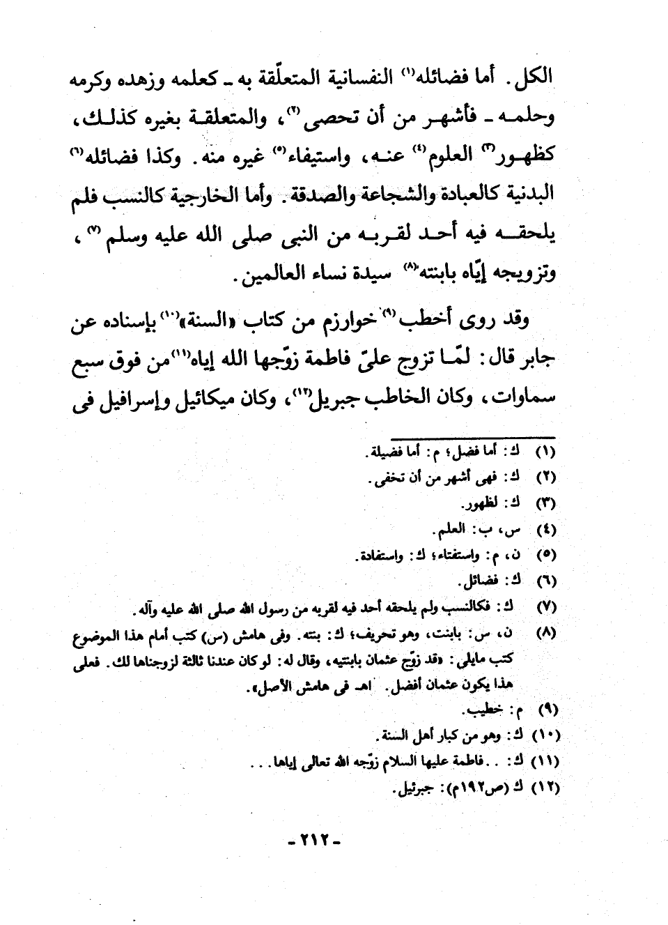 (¬8) ن، س: بِابْنَتِ، وَهُوَ تَحْرِيفٌ، ك: بِنْتَهُ وَفِي هَامِشِ (س) كَتَبَ أَمَامَ هَذَا الْمَوْضُوعِ كَتَبَ مَا يَلِي: " قَدْ زَوَّجَ عُثْمَانَ بِابْنَتَيْهِ وَقَالَ لَهُ: لَوْ كَانَ عِنْدَنَا ثَالِثَةٌ لَزَوَّجْنَاهَا لَكَ فَعَلَى هَذَا يَكُونُ عُثْمَانُ أَفْضَلَ. اهـ فِي هَامِشِ الْأَصْلِ ".