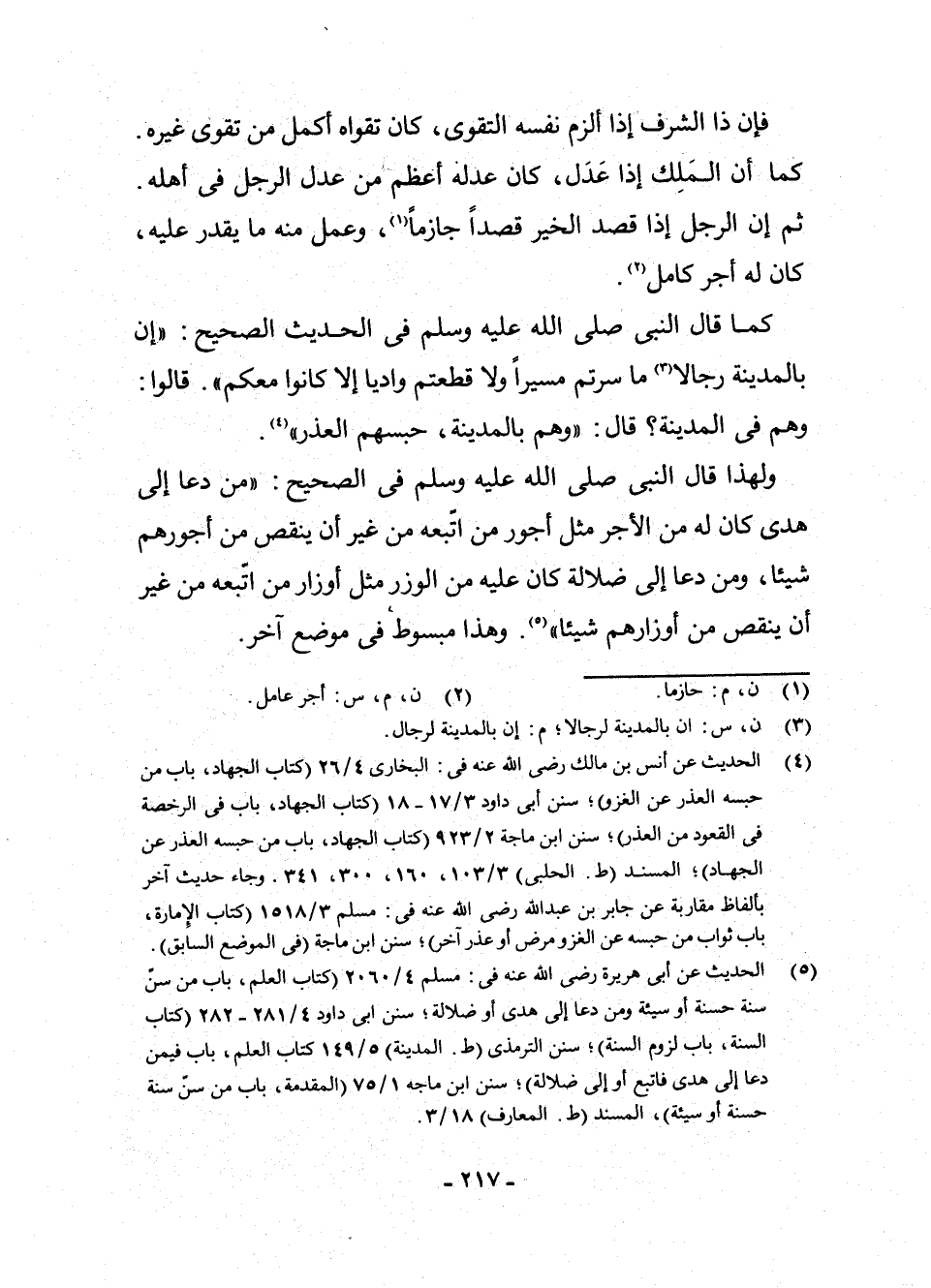 (¬5) الْحَدِيثُ عَنْ أَبِي هُرَيْرَةَ - رَضِيَ اللَّهُ عَنْهُ - فِي: مُسْلِمٍ 4/2060 (كِتَابُ الْعِلْمِ، بَابُ مَنْ سَنَّ سُنَّةً حَسَنَةً أَوْ سَيِّئَةً وَمَنْ دَعَا إِلَى هُدًى أَوْ ضَلَالَةٍ، سُنَنِ أَبِي دَاوُدَ 4/281 - 282 (كِتَابُ السُّنَّةِ، بَابُ لُزُومِ السُّنَّةِ) ، سُنَنِ التِّرْمِذِيِّ (ط. الْمَدِينَةِ) 5/149 كِتَابُ الْعِلْمِ، بَابٌ فِيمَنْ دَعَا إِلَى هُدًى فَاتُّبِعَ أَوْ إِلَى ضَلَالَةٍ) ; سُنَنِ ابْنِ مَاجَهْ 1/75 (الْمُقَدِّمَةُ، بَابُ مَنْ سَنَّ سُنَّةً حَسَنَةً أَوْ سَيِّئَةً، الْمُسْنَدِ (ط. الْمَعَارِفِ) 18/3.
