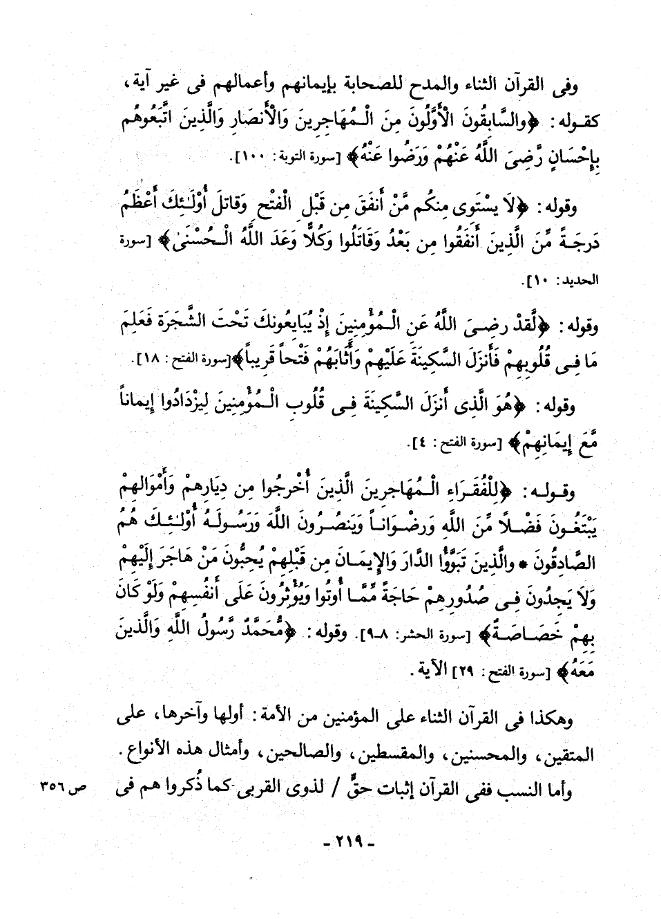 وَقَوْلِهِ: {لِلْفُقَرَاءِ الْمُهَاجِرِينَ الَّذِينَ أُخْرِجُوا مِنْ دِيارِهِمْ وَأَمْوَالِهِمْ يَبْتَغُونَ فَضْلًا مِنَ اللَّهِ وَرِضْوَانًا وَيَنْصُرُونَ اللَّهَ وَرَسُولَهُ أُولَئِكَ هُمُ الصَّادِقُونَ - وَالَّذِينَ تَبَوَّءُوا الدَّارَ وَالْإِيمَانَ مِنْ قَبْلِهِمْ يُحِبُّونَ مَنْ هَاجَرَ إِلَيْهِمْ وَلَا يَجِدُونَ فِي صُدُورِهِمْ حَاجَةً مِمَّا أُوتُوا وَيُؤْثِرُونَ عَلَى أَنْفُسِهِمْ وَلَوْ كَانَ بِهِمْ خَصَاصَةٌ} [سُورَةُ الْحَشْرِ: 8 - 9] . وَقَوْلِهِ: {مُحَمَّدٌ رَسُولُ اللَّهِ وَالَّذِينَ مَعَهُ} [سُورَةُ الْفَتْحِ: 29] الْآيَةَ.
