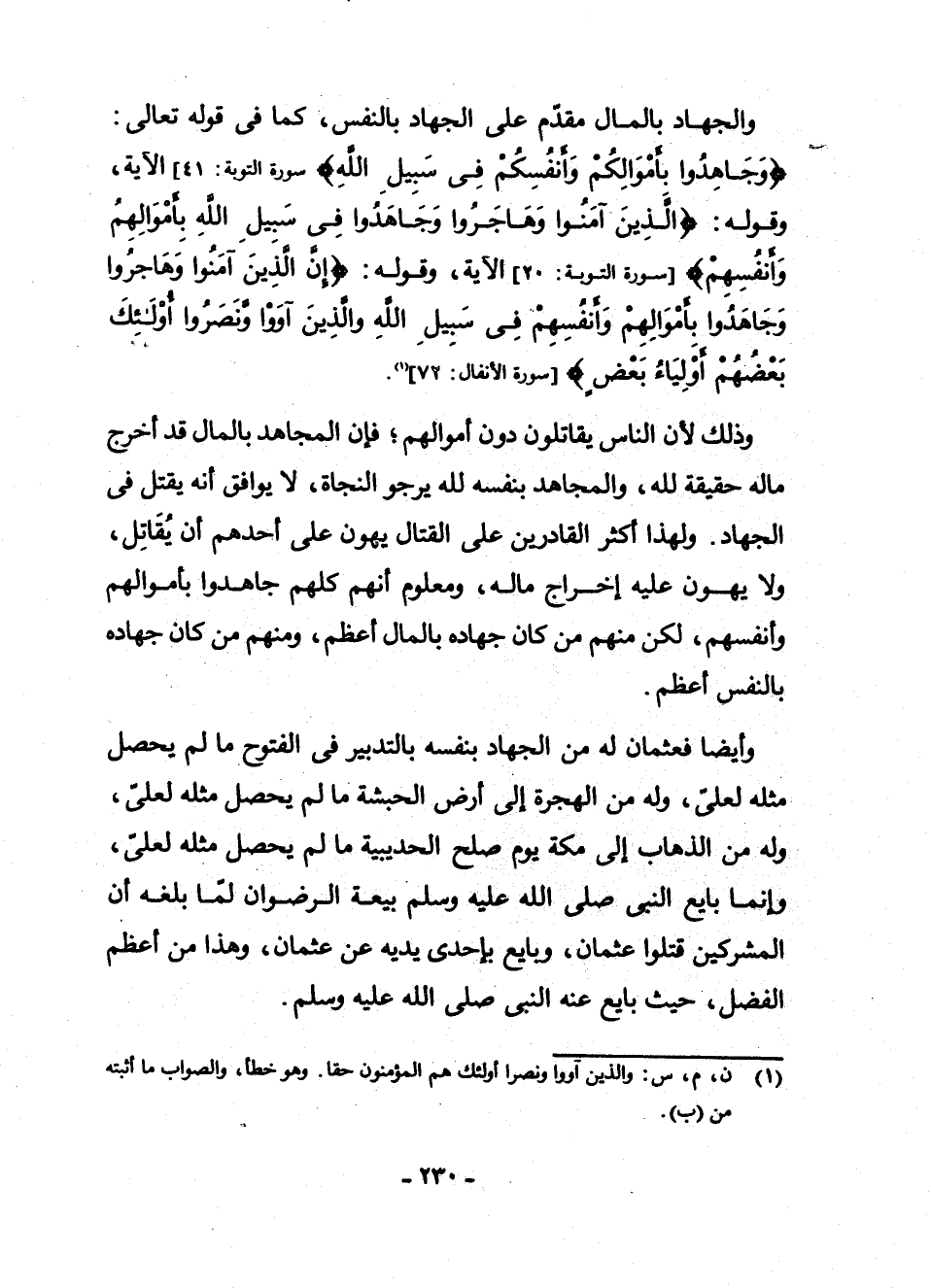 وَالْجِهَادُ بِالْمَالِ مُقَدَّمٌ عَلَى الْجِهَادِ بِالنَّفْسِ، كَمَا فِي قَوْلِهِ تَعَالَى: {وَجَاهِدُوا بِأَمْوَالِكُمْ وَأَنْفُسِكُمْ فِي سَبِيلِ اللَّهِ} [سُورَةُ التَّوْبَةِ: 41] الْآيَةَ، وَقَوْلِهِ: {الَّذِينَ آمَنُوا وَهَاجَرُوا وَجَاهَدُوا فِي سَبِيلِ اللَّهِ بِأَمْوَالِهِمْ وَأَنْفُسِهِمْ} [سُورَةُ التَّوْبَةِ: 20] الْآيَةَ، وَقَوْلِهِ: {إِنَّ الَّذِينَ آمَنُوا وَهَاجَرُوا وَجَاهَدُوا بِأَمْوَالِهِمْ وَأَنْفُسِهِمْ فِي سَبِيلِ اللَّهِ وَالَّذِينَ آوَوْا وَنَصَرُوا أُولَئِكَ بَعْضُهُمْ أَوْلِيَاءُ بَعْضٍ} [سُورَةُ الْأَنْفَالِ: 72] (¬1) .