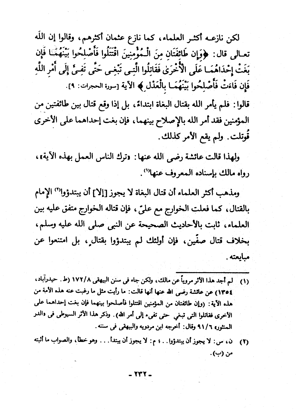 (¬1) لَمْ أَجِدْ هَذَا الْأَثَرَ مَرْوِيًّا عَنْ مَالِكٍ، وَلَكِنْ جَاءَ فِي سُنَنِ الْبَيْهَقِيِّ 8/172 (ط. حَيْدَرَ آبَادَ، 1354) عَنْ عَائِشَةَ - رَضِيَ اللَّهُ عَنْهَا - أَنَّهَا قَالَتْ: مَا رَأَيْتُ مِثْلَ مَا رَغِبَتْ عَنْهُ هَذِهِ الْأُمَّةُ مِنْ هَذِهِ الْآيَةِ: وَإِنْ طَائِفَتَانِ مِنَ الْمُؤْمِنِينَ اقْتَتَلُوا فَأَصْلِحُوا بَيْنَهُمَا فَإِنْ بَغَتْ إِحْدَاهُمَا عَلَى الْأُخْرَى فَقَاتِلُوا الَّتِي تَبْغِي حَتَّى تَفِيءَ إِلَى أَمْرِ اللَّهِ وَذَكَرَ هَذَا الْأَثَرَ السُّيُوطِيُّ فِي " الدُّرِّ الْمَنْثُورِ 6/91 وَقَالَ: أَخْرَجَهُ ابْنُ مَرْدَوَيْهِ وَالْبَيْهَقِيُّ فِي سُنَنِهِ.