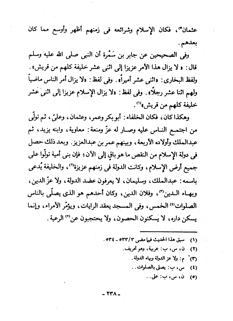 وَفِي الصَّحِيحَيْنِ عَنْ جَابِرِ بْنِ سَمُرَةَ أَنَّ النَّبِيَّ - صَلَّى اللَّهُ عَلَيْهِ وَسَلَّمَ - قَالَ: " «لَا يَزَالُ هَذَا الْأَمْرُ عَزِيزًا إِلَى اثْنَيْ عَشَرَ خَلِيفَةً كُلُّهُمْ مِنْ قُرَيْشٍ» ".