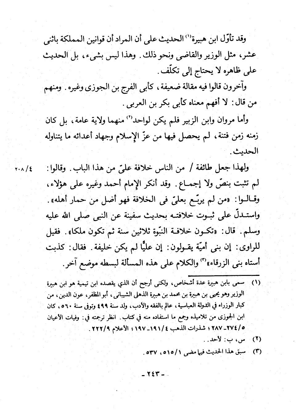 (¬1) سُمِّيَ بِابْنِ هُبَيْرَةَ عِدَّةُ أَشْخَاصٍ، وَلَكِنِّي أُرَجِّحُ أَنَّ الَّذِي يَقْصِدُهُ ابْنُ تَيْمِيَّةَ هُوَ ابْنُ هُبَيْرَةَ الْوَزِيرُ وَهُوَ يَحْيَى بْنُ هُبَيْرَةَ بْنِ مُحَمَّدِ بْنِ هُبَيْرَةَ الذُّهْلِيُّ الشَّيْبَانِيُّ أَبُو الْمُظَفَّرِ عَوْنُ الدِّينِ مِنْ كِبَارِ الْوُزَرَاءِ فِي الدَّوْلَةِ الْعَبَّاسِيَّةِ، عَالِمٌ بِالْفِقَهِ وَالْأَدَبِ، وُلِدَ سَنَةَ 499 وَتُوُفِّيَ سَنَةَ 560، كَانَ ابْنُ الْجَوْزِيِّ مِنْ تَلَامِيذِهِ وَجَمَعَ مَا اسْتَفَادَهُ مِنْهُ فِي كِتَابٍ. انْظُرْ تَرْجَمَتَهُ فِي: وَفَيَاتِ الْأَعْيَانِ 5/274 - 287 شَذَرَاتِ الذَّهَبِ 4/191 - 197 الْأَعْلَامِ 9/222