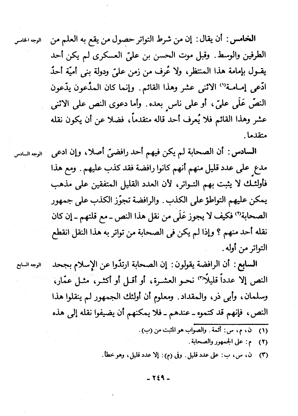 الْخَامِسُ: أَنْ يُقَالَ: إِنَّ مِنْ شُرُوطِ التَّوَاتُرِ حُصُولَ مَنْ يَقَعُ بِهِ الْعِلْمُ مِنَ الطَّرَفَيْنِ وَالْوَسَطِ. وَقَبْلَ مَوْتِ الْحَسَنِ بْنِ عَلِيٍّ الْعَسْكَرِيِّ لَمْ يَكُنْ أَحَدٌ يَقُولُ بِإِمَامَةِ هَذَا الْمُنْتَظَرِ، وَلَا عُرِفَ مِنْ زَمَنِ عَلِيٍّ وَدَوْلَةِ بَنِي أُمَيَّةَ أَحَدٌ ادَّعَى إِمَامَةَ (¬1) الِاثْنَيْ عَشَرَ، وَهَذَا الْقَائِمُ. وَإِنَّمَا كَانَ الْمُدَّعُونَ يَدَّعُونَ النَّصَّ عَلَى عَلِيٍّ، أَوْ عَلَى نَاسٍ بَعْدَهُ وَأَمَّا دَعْوَى النَّصِّ عَلَى الِاثْنَيْ عَشَرَ وَهَذَا الْقَائِمُ فَلَا يُعْرَفُ أَحَدٌ قَالَهُ مُتَقَدِّمًا، فَضْلًا عَنْ أَنْ يَكُونَ نَقْلُهُ مُتَقَدِّمًا.