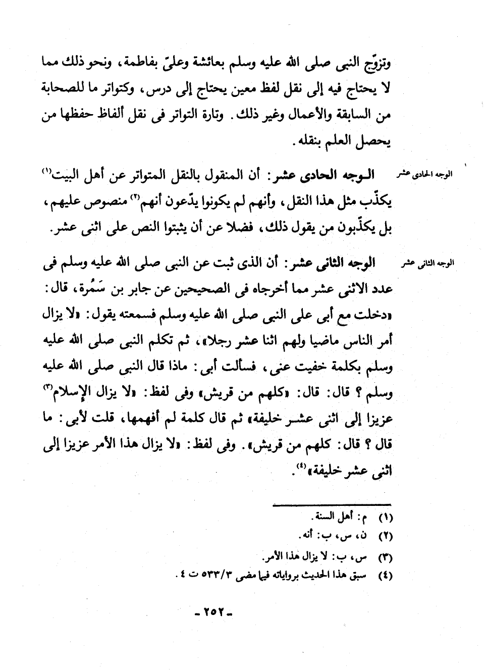 الْوَجْهُ الثَّانِي عَشَرَ: أَنَّ الَّذِي ثَبَتَ عَنِ النَّبِيِّ - صَلَّى اللَّهُ عَلَيْهِ وَسَلَّمَ - فِي عَدَدِ الِاثْنَيْ عَشَرَ مِمَّا أَخْرَجَاهُ فِي الصَّحِيحَيْنِ عَنْ جَابِرِ بْنِ سَمُرَةَ، قَالَ: «دَخَلْتُ مَعَ أَبِي عَلَى النَّبِيِّ - صَلَّى اللَّهُ عَلَيْهِ وَسَلَّمَ - فَسَمِعْتُهُ يَقُولُ: " لَا يَزَالُ أَمْرُ النَّاسِ مَاضِيًا وَلَهُمُ اثْنَا عَشَرَ رَجُلًا "، ثُمَّ تَكَلَّمَ النَّبِيُّ - صَلَّى اللَّهُ عَلَيْهِ وَسَلَّمَ - بِكَلِمَةٍ خَفِيَتْ عَنِّي، فَسَأَلْتُ أَبِي: مَاذَا قَالَ النَّبِيُّ - صَلَّى اللَّهُ عَلَيْهِ وَسَلَّمَ؟ قَالَ: قَالَ: " كُلُّهُمْ مِنْ قُرَيْشٍ» "، وَفِي لَفْظٍ: " «لَا يَزَالُ الْإِسْلَامُ (¬3) عَزِيزًا إِلَى اثْنَيْ عَشَرَ خَلِيفَةً "، ثُمَّ قَالَ كَلِمَةً لَمْ أَفْهَمْهَا، قُلْتُ لِأَبِي: مَا قَالَ؟ قَالَ: " كُلُّهُمْ مِنْ قُرَيْشٍ» ". وَفِي لَفْظٍ: " «لَا يَزَالُ هَذَا الْأَمْرُ عَزِيزًا إِلَى اثْنَيْ عَشَرَ خَلِيفَةً» " (¬4) .