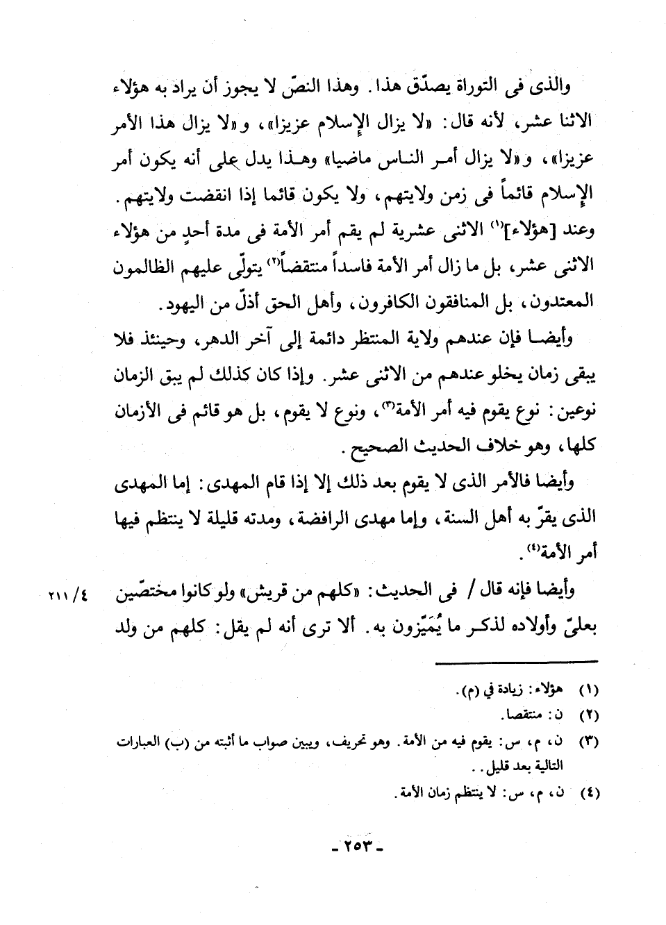 وَأَيْضًا فَإِنَّ عِنْدَهُمْ وِلَايَةَ الْمُنْتَظَرِ دَائِمَةٌ إِلَى آخِرِ الدَّهْرِ، وَحِينَئِذٍ فَلَا يَبْقَى زَمَانٌ يَخْلُو عِنْدَهُمْ مِنَ الِاثْنَيْ عَشَرَ. وَإِذَا كَانَ كَذَلِكَ لَمْ يَبْقَ الزَّمَانُ نَوْعَيْنِ: نَوْعٌ يَقُومُ فِيهِ أَمْرُ الْأُمَّةِ (¬3) ، وَنَوْعٌ لَا يَقُومُ، بَلْ هُوَ قَائِمٌ فِي الْأَزْمَانِ كُلِّهَا، وَهُوَ خِلَافُ الْحَدِيثِ الصَّحِيحِ.
