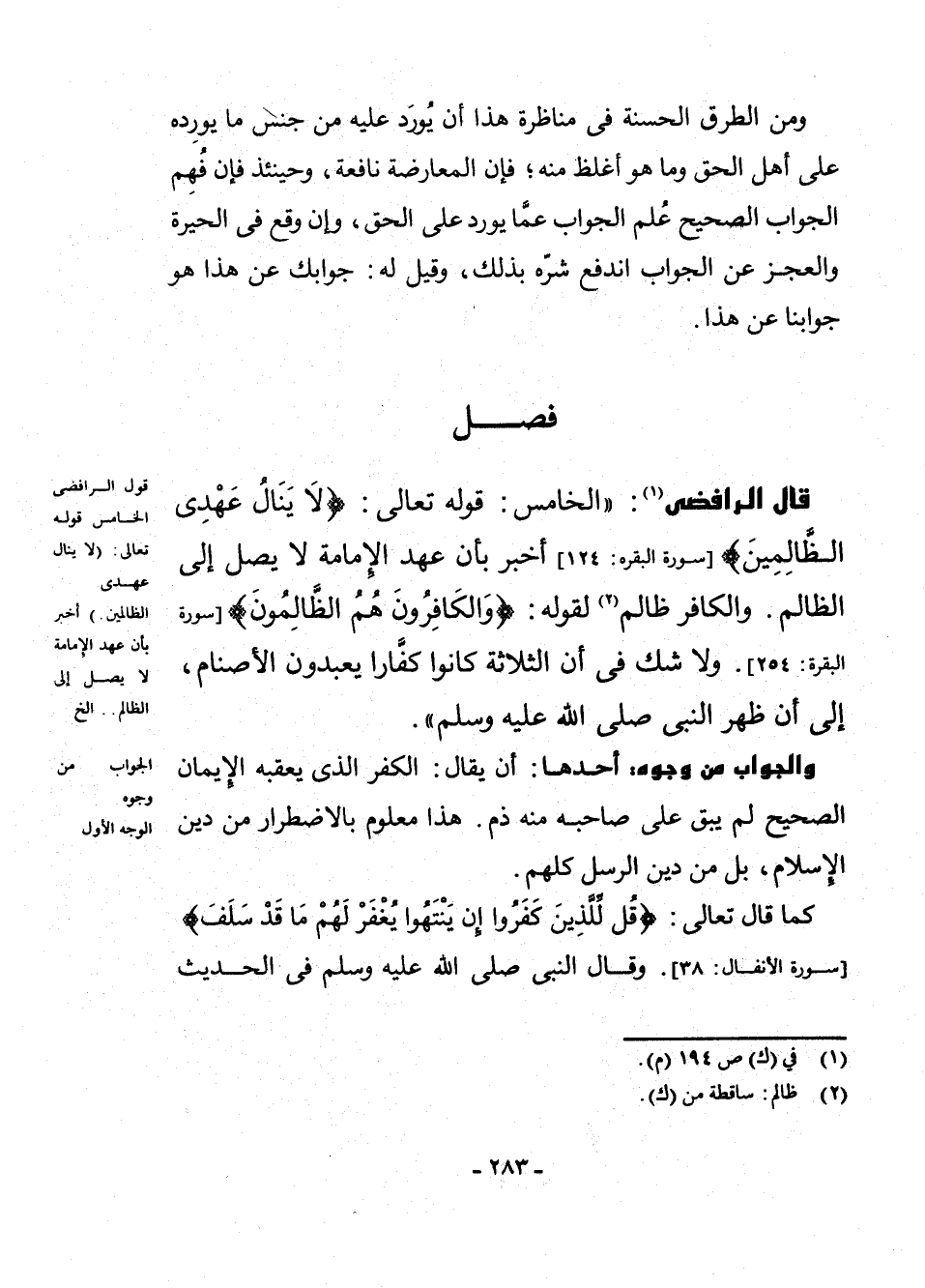 قَالَ الرَّافِضِيُّ (¬1) : " الْخَامِسُ: قَوْلُهُ تَعَالَى: {لَا يَنَالُ عَهْدِي الظَّالِمِينَ} [سُورَةُ الْبَقَرَةِ: 124] أَخْبَرَ بِأَنَّ عَهْدَ الْإِمَامَةِ لَا يَصِلُ إِلَى الظَّالِمِ. وَالْكَافِرُ ظَالِمٌ (¬2) ; لِقَوْلِهِ: {وَالْكَافِرُونَ هُمُ الظَّالِمُونَ} [سُورَةُ الْبَقَرَةِ: 254] . وَلَا شَكَّ فِي أَنَّ الثَّلَاثَةَ كَانُوا كُفَّارًا يَعْبُدُونَ الْأَصْنَامَ، إِلَى أَنْ ظَهَرَ النَّبِيُّ - صَلَّى اللَّهُ عَلَيْهِ وَسَلَّمَ ".