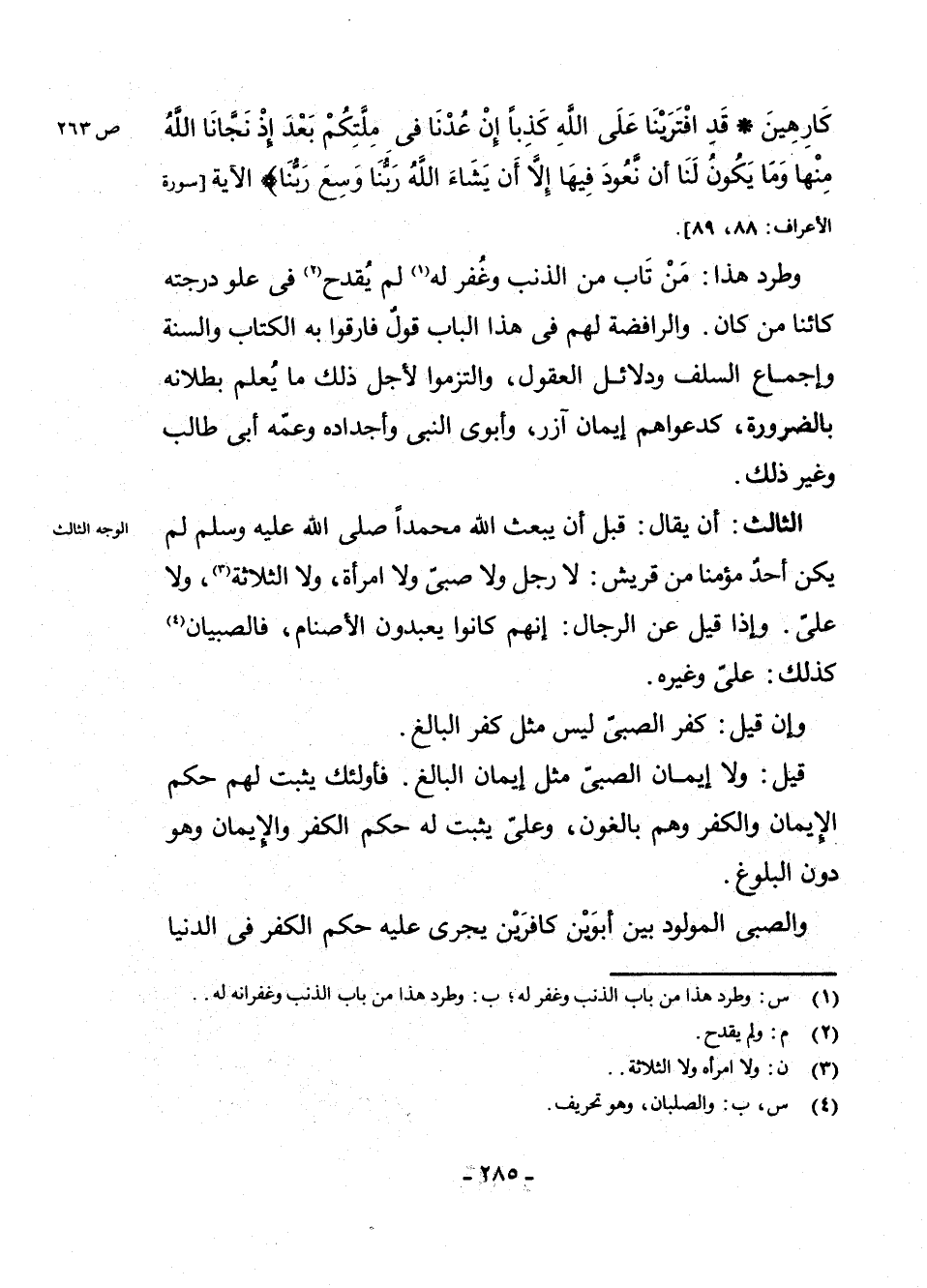 الثَّالِثُ: أَنْ يُقَالَ: قَبْلَ أَنْ يَبْعَثَ اللَّهُ مُحَمَّدًا - صَلَّى اللَّهُ عَلَيْهِ وَسَلَّمَ - لَمْ يَكُنْ أَحَدٌ مُؤْمِنًا مِنْ قُرَيْشٍ: لَا رَجُلٌ وَلَا صَبِيٌّ وَلَا امْرَأَةٌ، وَلَا الثَّلَاثَةُ (¬3) ، وَلَا عَلِيٌّ، وَإِذَا قِيلَ عَنِ الرِّجَالِ: إِنَّهُمْ كَانُوا يَعْبُدُونَ الْأَصْنَامَ، فَالصِّبْيَانُ (¬4) كَذَلِكَ: عَلِيٌّ وَغَيْرُهُ.