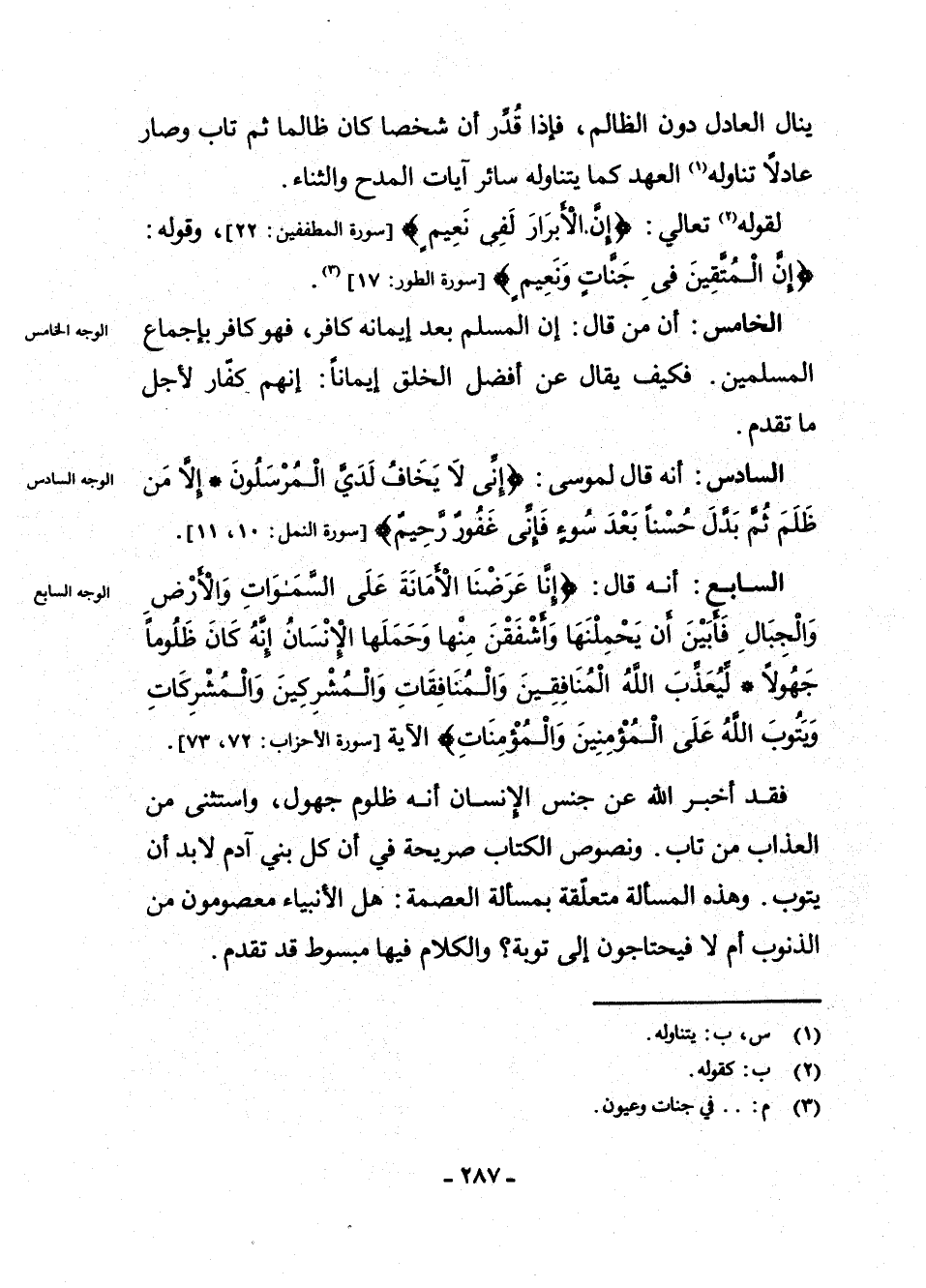 فَقَدْ أَخْبَرَنَا اللَّهُ عَنْ جِنْسِ الْإِنْسَانِ أَنَّهُ ظَلُومٌ جَهُولٌ، وَاسْتَثْنَى مِنَ الْعَذَابِ مَنْ تَابَ. وَنُصُوصُ الْكِتَابِ صَرِيحَةٌ فِي أَنَّ كُلَّ بَنِي آدَمَ لَا بُدَّ أَنْ يَتُوبَ. وَهَذِهِ الْمَسْأَلَةُ مُتَعَلِّقَةٌ بِمَسْأَلَةِ الْعِصْمَةِ: هَلِ الْأَنْبِيَاءُ مَعْصُومُونَ مِنَ الذُّنُوبِ أَمْ لَا فَيَحْتَاجُونَ إِلَى تَوْبَةٍ؟ وَالْكَلَامُ فِيهَا مَبْسُوطٌ قَدْ تَقَدَّمَ.