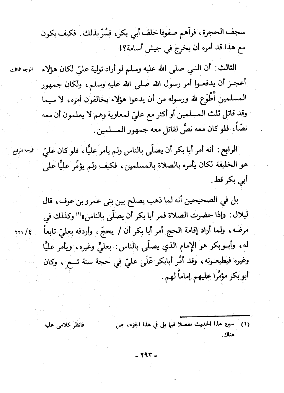 الرَّابِعُ: أَنَّهُ أَمَرَ أَبَا بَكْرٍ أَنْ يُصَلِّيَ بِالنَّاسِ وَلَمْ يَأْمُرْ عَلِيًّا، فَلَوْ كَانَ عَلِيٌّ هُوَ الْخَلِيفَةَ لَكَانَ يَأْمُرُهُ بِالصَّلَاةِ بِالْمُسْلِمِينَ، فَكَيْفَ وَلَمْ يُؤَمِّرْ عَلِيًّا عَلَى أَبِي بَكْرٍ قَطُّ؟ !