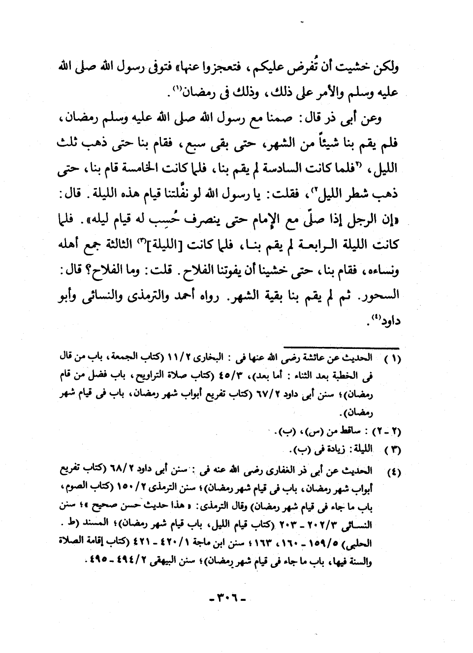 (¬4) الْحَدِيثُ عَنْ أَبِي ذَرٍّ الْغِفَارِيِّ رَضِيَ اللَّهُ عَنْهُ فِي: سُنَنِ أَبِي دَاوُدَ 2/68 (كِتَابُ تَفْرِيعِ أَبْوَابِ شَهْرِ رَمَضَانَ، بَابٌ فِي قِيَامِ شَهْرِ رَمَضَانَ) سُنَنِ التِّرْمِذِيِّ 2/150 (كِتَابُ الصَّوْمِ بَابُ مَا جَاءَ مِنْ قِيَامِ شَهْرِ رَمَضَانَ) وَقَالَ التِّرْمِذِيُّ: " هَذَا حَدِيثٌ حَسَنٌ صَحِيحٌ، سُنَنِ النَّسَائِيِّ 3/202 - 203 (كِتَابُ قِيَامِ اللَّيْلِ، بَابُ قِيَامِ شَهْرِ رَمَضَانَ) الْمُسْنَدِ (ط الْحَلَبِيِّ) 5/159 - 160، 163، سُنَنِ ابْنِ مَاجَهْ 1/420 - 421 (كِتَابُ إِقَامَةِ الصَّلَاةِ وَالسُّنَّةِ فِيهَا بَابُ مَا جَاءَ فِي قِيَامِ شَهْرِ رَمَضَانَ) سُنَنِ الْبَيْهَقِيِّ 2/494 - 495