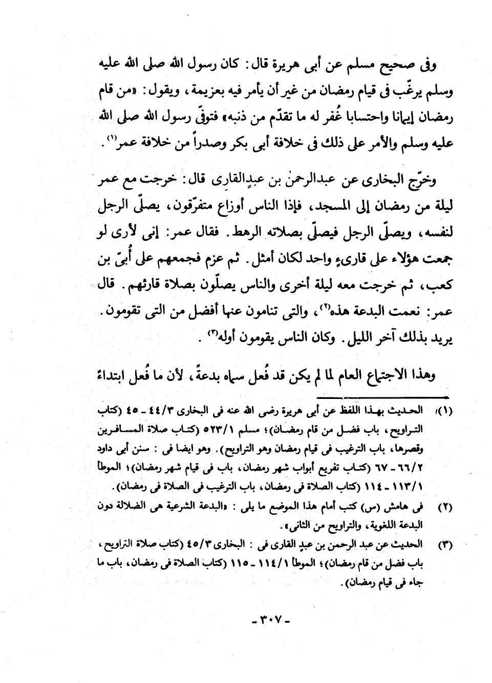 (¬3) الْحَدِيثُ عَنْ عَبْدِ الرَّحْمَنِ بْنِ عَبْدٍ الْقَارِيِّ فِي: الْبُخَارِيِّ 3/45 (كِتَابُ صَلَاةِ التَّرَاوِيحِ، بَابُ فَضْلِ مَنْ قَامَ رَمَضَانَ) الْمُوَطَّأِ 1/114 - 115 (كِتَابُ الصَّلَاةِ فِي رَمَضَانَ، بَابُ مَا جَاءَ فِي قِيَامِ رَمَضَانَ)
