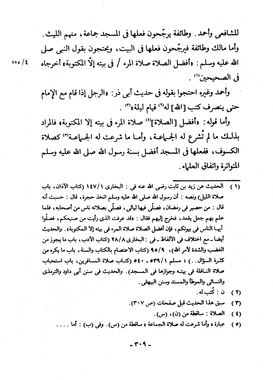 (¬1) الْحَدِيثُ عَنْ زَيْدِ بْنِ ثَابِتٍ رَضِيَ اللَّهُ عَنْهُ فِي: الْبُخَارِيِّ 1/147 (كِتَابُ الْأَذَانِ، بَابُ صَلَاةِ اللَّيْلِ) وَنَصُّهُ: أَنَّ رَسُولَ اللَّهِ صَلَّى اللَّهُ عَلَيْهِ وَسَلَّمَ اتَّخَذَ حُجْرَةً، قَالَ حَسِبْتُ أَنَّهُ قَالَ: مِنْ حَصِيرٍ فِي رَمَضَانَ، فَصَلَّى فِيهَا لَيَالِيَ، فَصَلَّى بِصَلَاتِهِ نَاسٌ مِنْ أَصْحَابِهِ فَلَمَّا عَلِمَ بِهِمْ جَعَلَ يَقْعُدُ فَخَرَجَ إِلَيْهِمْ فَقَالَ: قَدْ عَرَفْتُ الَّذِي رَأَيْتُ مِنْ صَنِيعِكُمْ فَصَلُّوا أَيُّهَا النَّاسُ فِي بُيُوتِكُمْ فَإِنَّ أَفْضَلَ الصَّلَاةِ صَلَاةُ الْمَرْءِ فِي بَيْتِهِ إِلَّا الْمَكْتُوبَةَ " وَالْحَدِيثُ أَيْضًا - مَعَ اخْتِلَافٍ فِي الْأَلْفَاظِ - فِي: الْبُخَارِيِّ 8/28 (كِتَابُ الْأَدَبِ، بَابُ مَا يَجُوزُ مِنَ الْغَضَبِ وَالشِّدَّةِ لِأَمْرِ اللَّهِ) ، 9/95 (كِتَابُ الِاعْتِصَامِ بِالْكِتَابِ وَالسُّنَّةِ، بَابُ مَا يُكْرَهُ مِنْ كَثْرَةِ السُّؤَالِ. .) مُسْلِمٍ 1/539 - 540 (كِتَابُ صَلَاةِ الْمُسَافِرِينَ، بَابُ اسْتِحْبَابِ صَلَاةِ النَّافِلَةِ فِي بَيْتِهِ وَجَوَازِهَا فِي الْمَسْجِدِ) وَالْحَدِيثُ فِي سُنَنِ أَبِي دَاوُدَ وَالتِّرْمِذِيِّ وَالنَّسَائِيِّ وَالْمُوَطَّأِ وَالْمُسْنَدِ وَسُنَنِ الْبَيْهَقِيِّ