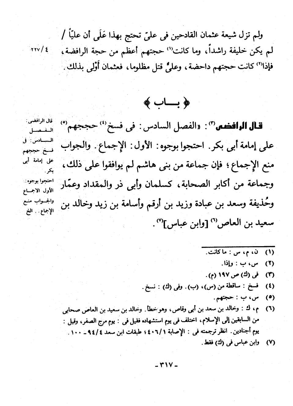 قَالَ الرَّافِضِيُّ (¬3) : الْفَصْلُ السَّادِسُ: فِي فَسْخِ (¬4) حُجَجِهِمْ (¬5) عَلَى إِمَامَةِ أَبِي بَكْرٍ احْتَجُّوا بِوُجُوهٍ: الْأَوَّلُ: الْإِجْمَاعُ، وَالْجَوَابُ: مَنْعُ الْإِجْمَاعِ، فَإِنَّ جَمَاعَةً مِنْ بَنِي هَاشِمٍ لَمْ يُوَافِقُوا عَلَى ذَلِكَ وَجَمَاعَةً مِنْ أَكَابِرِ الصَّحَابَةِ كَسَلْمَانَ وَأَبِي ذَرٍّ وَالْمِقْدَادِ وَعَمَّارٍ وَحُذَيْفَةَ وَسَعْدِ بْنِ عُبَادَةَ وَزَيْدِ بْنِ أَرْقَمَ وَأُسَامَةَ بْنِ زَيْدٍ وَخَالِدِ بْنِ سَعِيدِ بْنِ الْعَاصِ (¬6) [وَابْنِ عَبَّاسٍ] (¬7) .