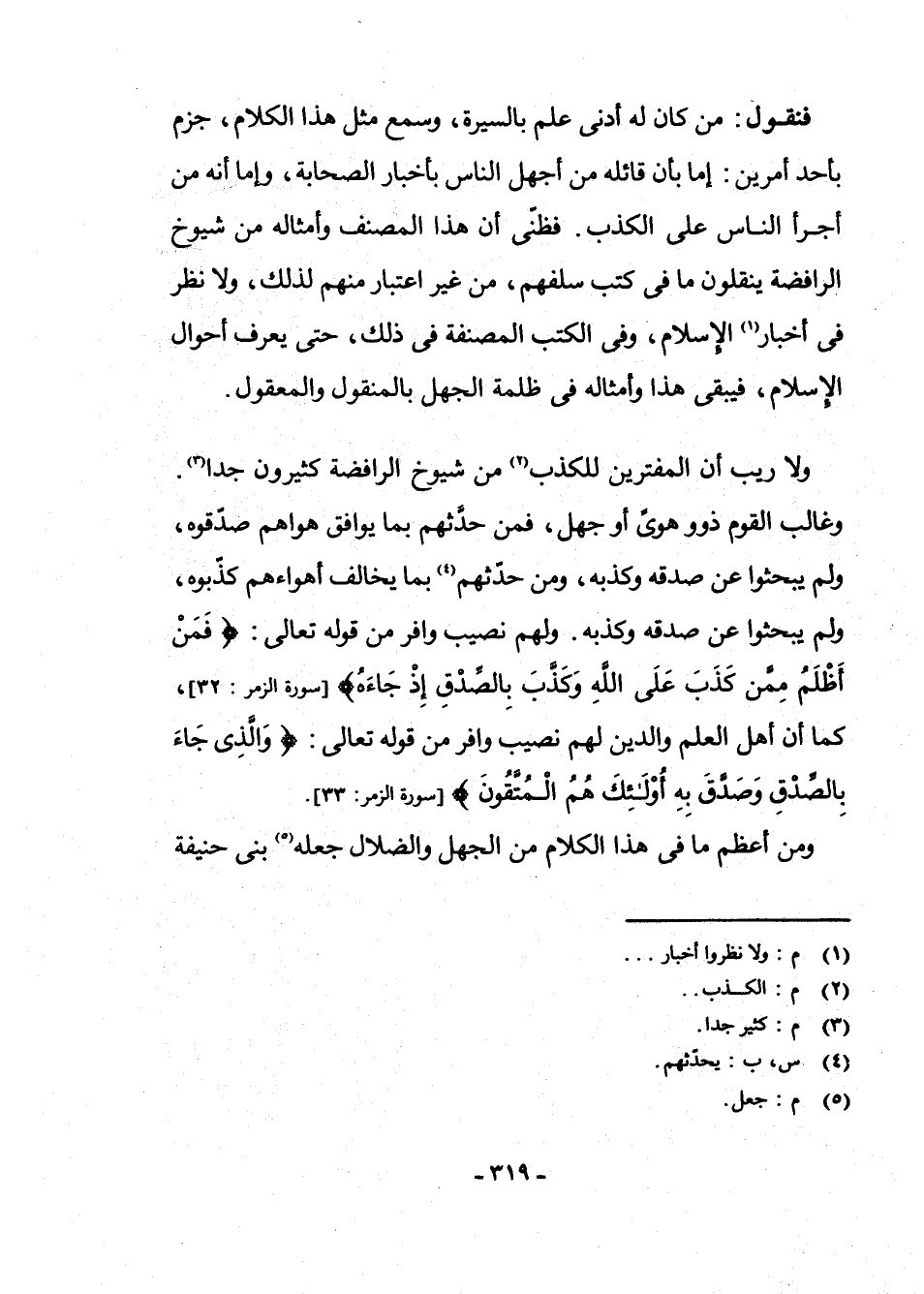 فَنَقُولُ: مَنْ كَانَ لَهُ أَدْنَى عِلْمٍ بِالسِّيرَةِ، وَسَمِعَ مِثْلَ هَذَا الْكَلَامِ، جَزَمَ بِأَحَدِ أَمْرَيْنِ: إِمَّا بِأَنَّ قَائِلَهُ مِنْ أَجْهَلِ النَّاسِ بِأَخْبَارِ الصَّحَابَةِ، وَإِمَّا أَنَّهُ مِنْ أَجْرَأِ النَّاسِ عَلَى الْكَذِبِ، فَظَنِّي أَنَّ هَذَا الْمُصَنِّفَ وَأَمْثَالَهُ مِنْ شُيُوخِ الرَّافِضَةِ يَنْقُلُونَ مَا فِي كُتُبِ سَلَفِهِمْ مِنْ غَيْرِ اعْتِبَارٍ مِنْهُمْ لِذَلِكَ، وَلَا نَظَرٍ فِي أَخْبَارِ (¬1) الْإِسْلَامِ، وَفِي الْكُتُبِ الْمُصَنَّفَةِ فِي ذَلِكَ حَتَّى يَعْرِفَ أَحْوَالَ الْإِسْلَامِ فَيَبْقَى هَذَا وَأَمْثَالُهُ فِي ظُلْمَةِ الْجَهْلِ بِالْمَنْقُولِ وَالْمَعْقُولِ.